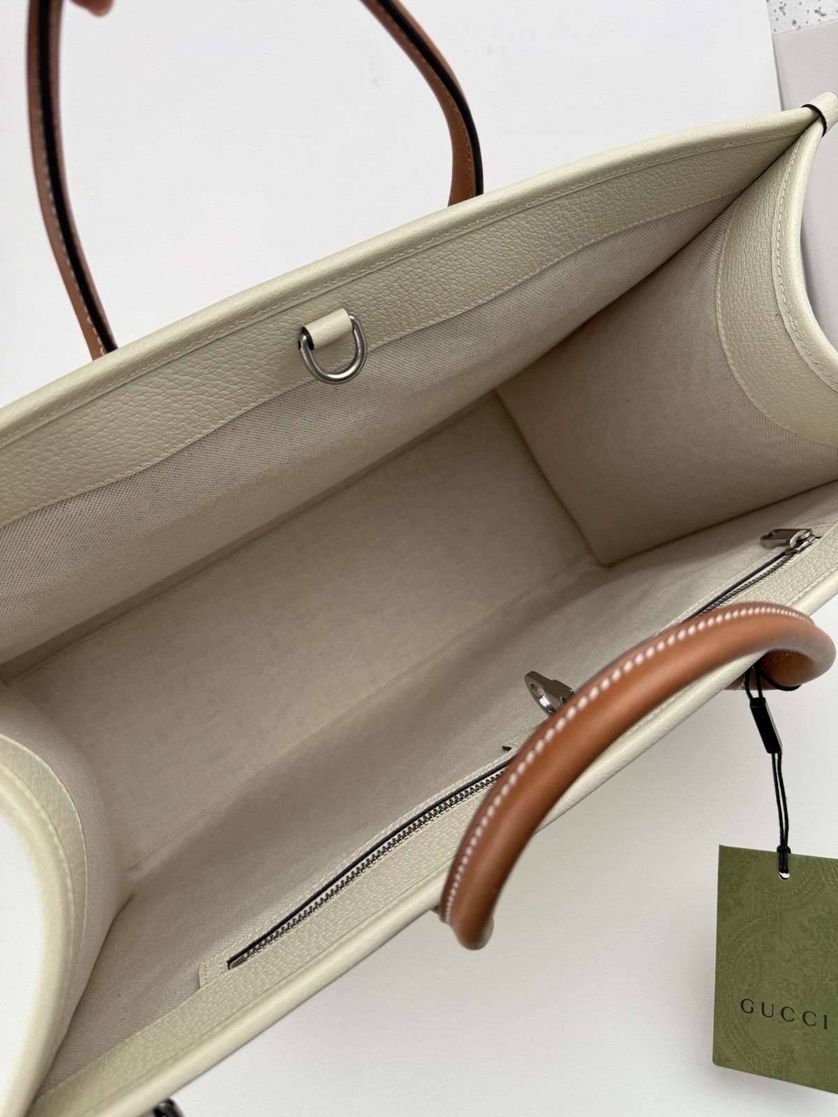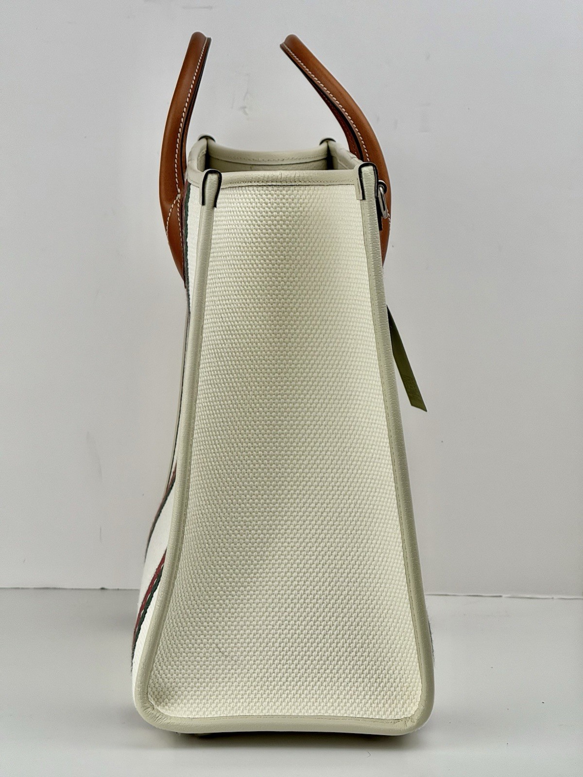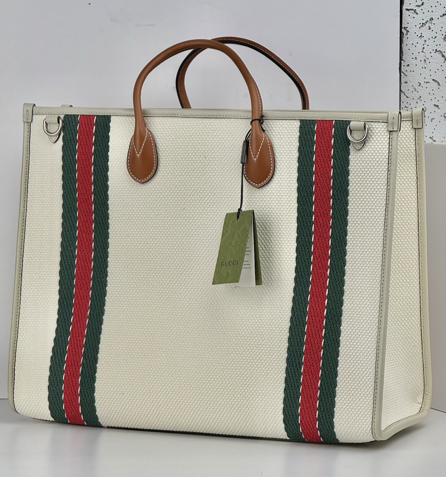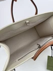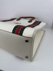 This Gucci tote bag is a stylish addition to any wardrobe. The white canvas and leather exterior features the iconic Gucci GG pattern and an interlocking top handle in brown. The spacious interior is lined with leather and includes a original dust bag for storage. Perfect for casual occasions, this every day bag has a width of 17 inches, a height of 13 inches, and a depth of 7 inches. The double handles make it easy to carry. Add a touch of luxury to your outfit with this Gucci tote bag.