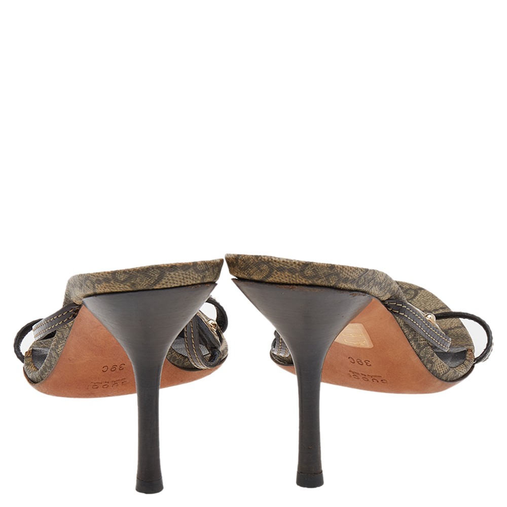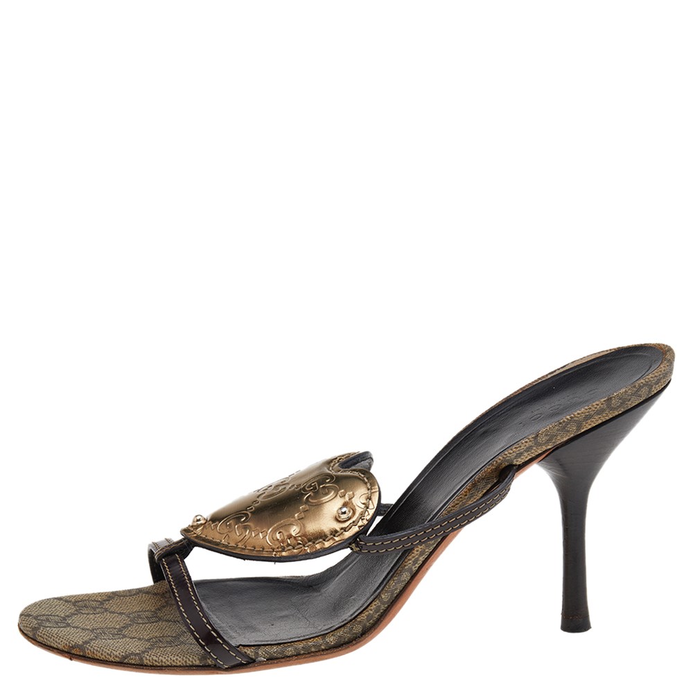 Sweetly complementing your short dresses for casual outings, these sandals from Gucci are crafted with leather featuring a heart shaped crest on the frontal straps. Set on 10 cm heels, these are complete with leather soles.Certified by The Luxury Closet - This item has gone through a detailed authentication process overseen by our experts. We offer a lifetime guarantee of authenticity on all our items. Import duties, taxes and charges are not included in the item price. These charges are the buyers responsibility. Please check with your country’s customs office to determine what these additional cost will be prior to buying. Our eBay Store About Us Contact Us Add to Favorite Sellers Gucci Brown/Gold GG Leather Crest Slide Sandals Size 39 $377.3 Sweetly complementing your short dresses for casual outings, these sandals from Gucci are crafted with leather featuring a heart shaped crest on the frontal straps. Set on 10 cm heels, these are complete with leather soles. Product Details Brand Color Gold Dimensions Material Leather Size 39 Outsole Width 9 cm Outsole Length 24 cm Heel Height 10 cm Includes The Luxury Closet Packaging Certified by The Luxury Closet This item has gone through a detailed authentication process overseen by our experts. We offer a lifetime guarantee of authenticity on all our items. How We Check The in-house team of experts at The Luxury Closet is highly trained to verify the authenticity and the condition of the luxury products. They ensure that only 100% authentic items are put on sale.The evaluation process is unique with its own mix of assessment criteria and differs according to the category. Each item is evaluated based on the following combination of hallmarks, hardware, stitching, symmetry, material, craftsmanship, stamping, codes, hologram stickers, and packaging. Our authenticators also check if the items have been modified or amended (e.g., aftermarket diamonds, replaced batteries, repaired bags, etc.) International Buyers Import duties, taxes and charges are not included in the item price. These charges are the buyers responsibility. Please check with your country’s customs office to determine what these additional cost will be prior to buying.
