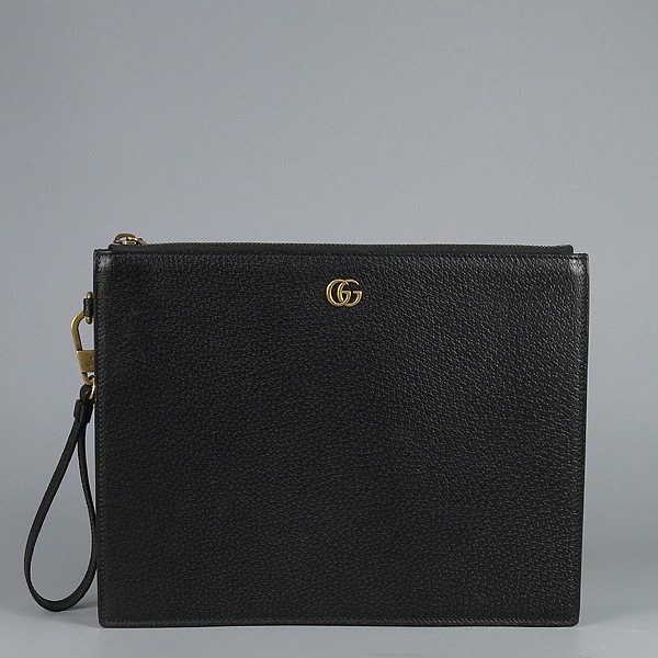 Size: 28 cm wide/ 22 cm/ width 3 cm Color: black Accessories: case/dust Gucci (Gucci) 547077 black leather GG Marmont (Marmont) gold logo clutch bag [Gangnam Main Store]. The store price is 1; 230; 000 won. The material is leather. There are 6 kard slots and 1 pocket on the inside. **Due to the nature of second-hand luxury goods, there may be stains not visible in the image. **