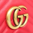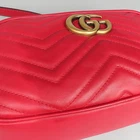 Size: 24 cm width/ 13 cm/ width 7 cm/ strap height ~ 60 cm Color: red accessories: Shinsegae Department Store purchase receipt/dust/ booklet Gucci (Gucci) 447632 red leather GG Marmont (Marmont) Matelassé gold logo chain crossbag [Cheonan Shinsegae Store]. There is 1 small multi-use storage pocket. GG Marmont small soft structured chain shoulder bag Top zip closure and double G metal decoration Chain shoulder strap with leather shoulder detail. Made of matelassé leather with a chevron design and GG motif on the back. Made in Italian black matelassé chevron leather and antique gold-tone metal details with GG decoration on the back, double G inner open pocket, adjustable chain shoulder strap; 60 cm drop. Can also be worn as a crossbody Zipper closure and long long zipper puller **Purchase precautions** This is a product with contamination on the front body.