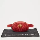 Vibrant and versatile, the Gucci GG Marmont Belt bag in red matelassé leather brings hands free luxury to life. Featuring the iconic double G logo and chevron stitching, this piece cinches at the waist with flair—perfect for festival styling, travel, or casual chic city looks.Certified by The Luxury Closet - This item has gone through a detailed authentication process overseen by our experts. We offer a lifetime guarantee of authenticity on all our items. Import duties, taxes and charges are not included in the item price. These charges are the buyers responsibility. Please check with your country’s customs office to determine what these additional cost will be prior to buying. Our eBay Store About Us Contact Us Add to Favorite Sellers Gucci Red Matelassé Leather GG Marmont Belt Bag $590.7 Vibrant and versatile, the Gucci GG Marmont Belt bag in red matelassé leather brings hands free luxury to life. Featuring the iconic double G logo and chevron stitching, this piece cinches at the waist with flair—perfect for festival styling, travel, or casual chic city looks. Product Details Brand Color Red Dimensions Material Leather Size Outsole Width Outsole Length Heel Height Includes Certified by The Luxury Closet This item has gone through a detailed authentication process overseen by our experts. We offer a lifetime guarantee of authenticity on all our items. How We Check The in-house team of experts at The Luxury Closet is highly trained to verify the authenticity and the condition of the luxury products. They ensure that only 100% authentic items are put on sale.The evaluation process is unique with its own mix of assessment criteria and differs according to the category. Each item is evaluated based on the following combination of hallmarks, hardware, stitching, symmetry, material, craftsmanship, stamping, codes, hologram stickers, and packaging. Our authenticators also check if the items have been modified or amended (e.g., aftermarket diamonds, replaced batteries, repaired bags, etc.) International Buyers Import duties, taxes and charges are not included in the item price. These charges are the buyers responsibility. Please check with your country’s customs office to determine what these additional cost will be prior to buying.