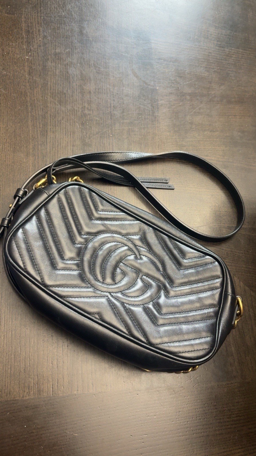 This chic crossbody is a must-have! The soft black leather and gold GG hardware give it a luxe yet timeless vibe. Perfect size for essentials, stays lightweight even when full. The chevron quilting adds texture, while the adjustable strap makes it super versatile—dress it up or keep it casual. Love that it fits my phone, wallet, and keys without feeling bulky. The zipper closure keeps everything secure, and the microfiber lining feels premium. Goes with everything from jeans to little black dresses. Worth every penny!
