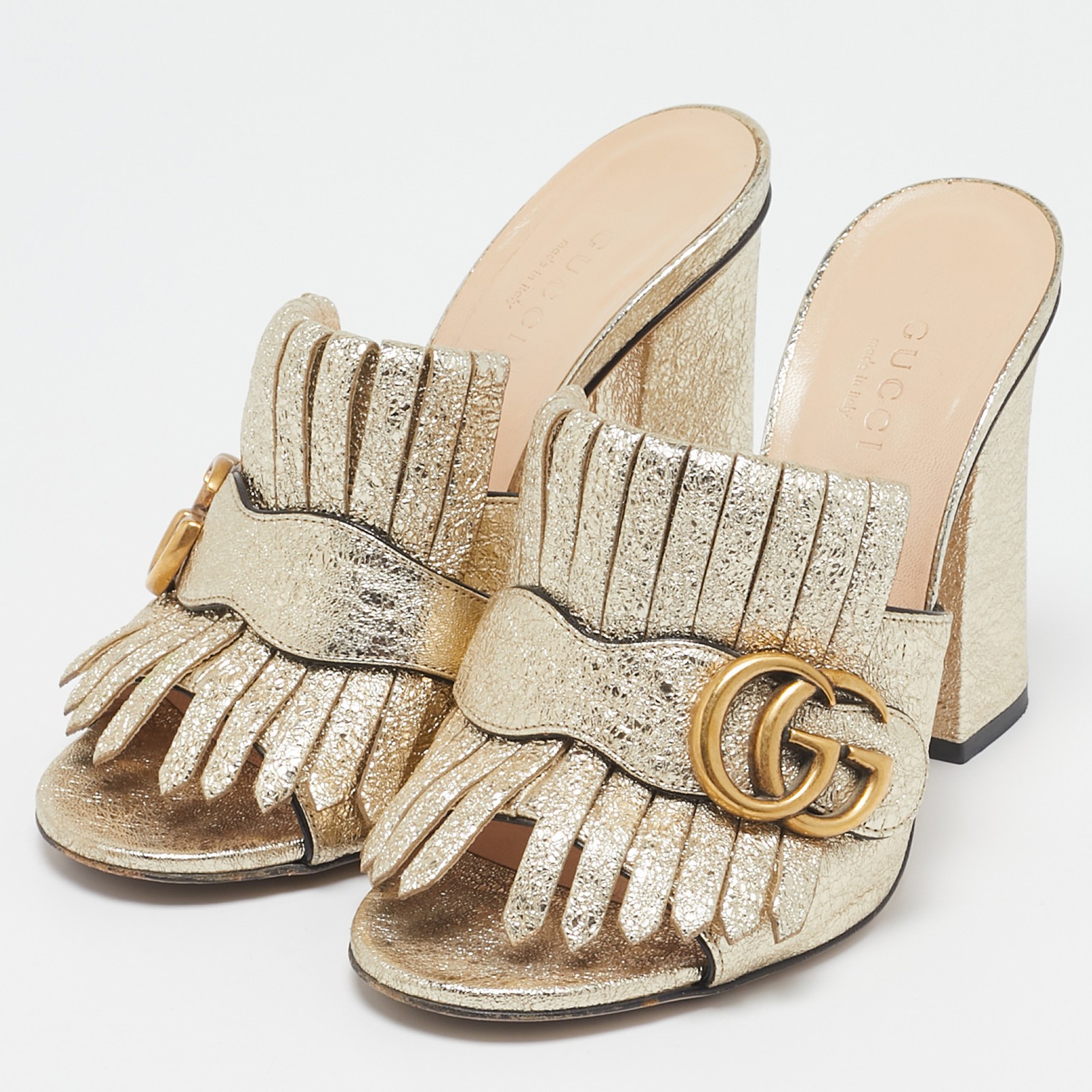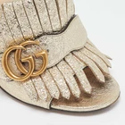 Gucci’s Marmont slide sandals in silver crackle leather feature a fringed vamp and signature GG hardware. The metallic finish adds a bold twist to the easy slip on design.Certified by The Luxury Closet - This item has gone through a detailed authentication process overseen by our experts. We offer a lifetime guarantee of authenticity on all our items. Import duties, taxes and charges are not included in the item price. These charges are the buyers responsibility. Please check with your country’s customs office to determine what these additional cost will be prior to buying. Our eBay Store About Us Contact Us Add to Favorite Sellers Gucci Silver Crackle Leather GG Marmont Fringed Slide Sandals Size 35 $322.3 Gucci’s Marmont slide sandals in silver crackle leather feature a fringed vamp and signature GG hardware. The metallic finish adds a bold twist to the easy slip on design. Product Details Brand Color Gold Dimensions Material Leather Size 35 Outsole Width 8.5 cm Outsole Length 19.5 cm Heel Height 10 cm Includes Original Dustbag Certified by The Luxury Closet This item has gone through a detailed authentication process overseen by our experts. We offer a lifetime guarantee of authenticity on all our items. How We Check The in-house team of experts at The Luxury Closet is highly trained to verify the authenticity and the condition of the luxury products. They ensure that only 100% authentic items are put on sale.The evaluation process is unique with its own mix of assessment criteria and differs according to the category. Each item is evaluated based on the following combination of hallmarks, hardware, stitching, symmetry, material, craftsmanship, stamping, codes, hologram stickers, and packaging. Our authenticators also check if the items have been modified or amended (e.g., aftermarket diamonds, replaced batteries, repaired bags, etc.) International Buyers Import duties, taxes and charges are not included in the item price. These charges are the buyers responsibility. Please check with your country’s customs office to determine what these additional cost will be prior to buying.