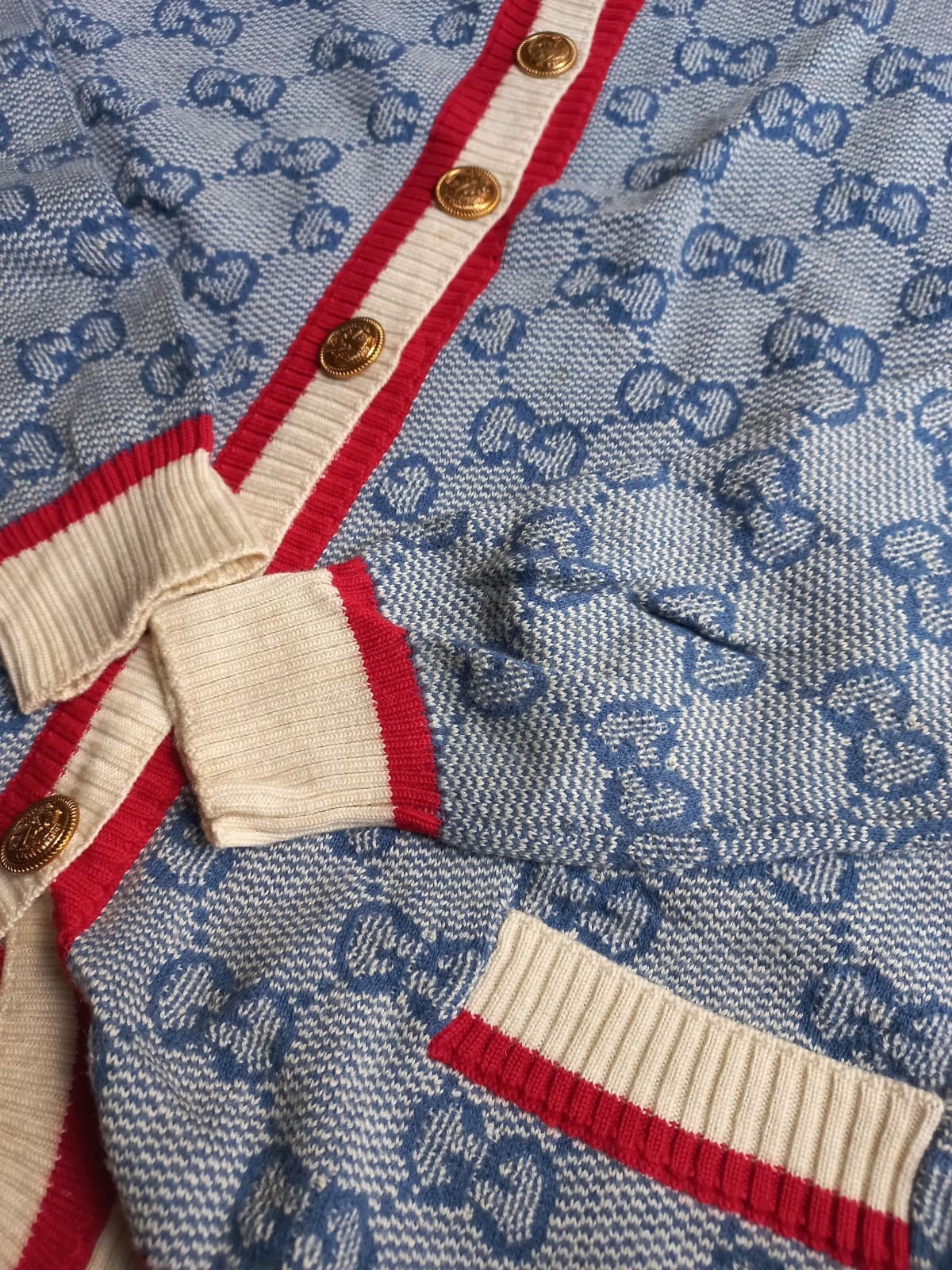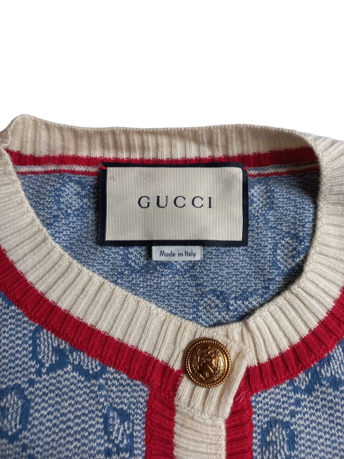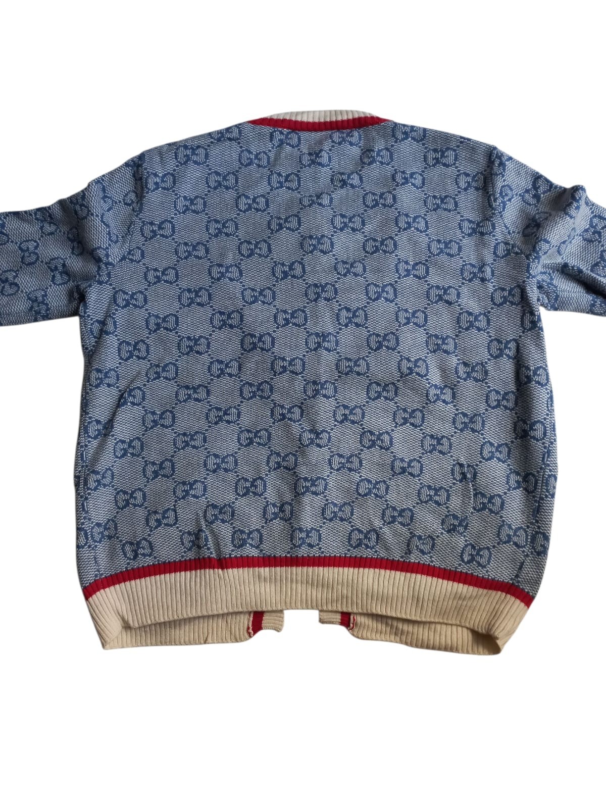 The Gucci GG Monogram Blue Cotton Knit Cardigan for Women is a stylish and luxurious addition to any wardrobe. Made in Italy with high-quality cotton, this cable-knit cardigan features a classic crew neck and raglan sleeves for a relaxed fit. The iconic GG logo adds a touch of personalization, making it a unique and fashionable choice for casual occasions during the fall season. Available in size L, this sweater is designed for a regular fit and is sure to make a statement with its solid blue color and cable-knit pattern.