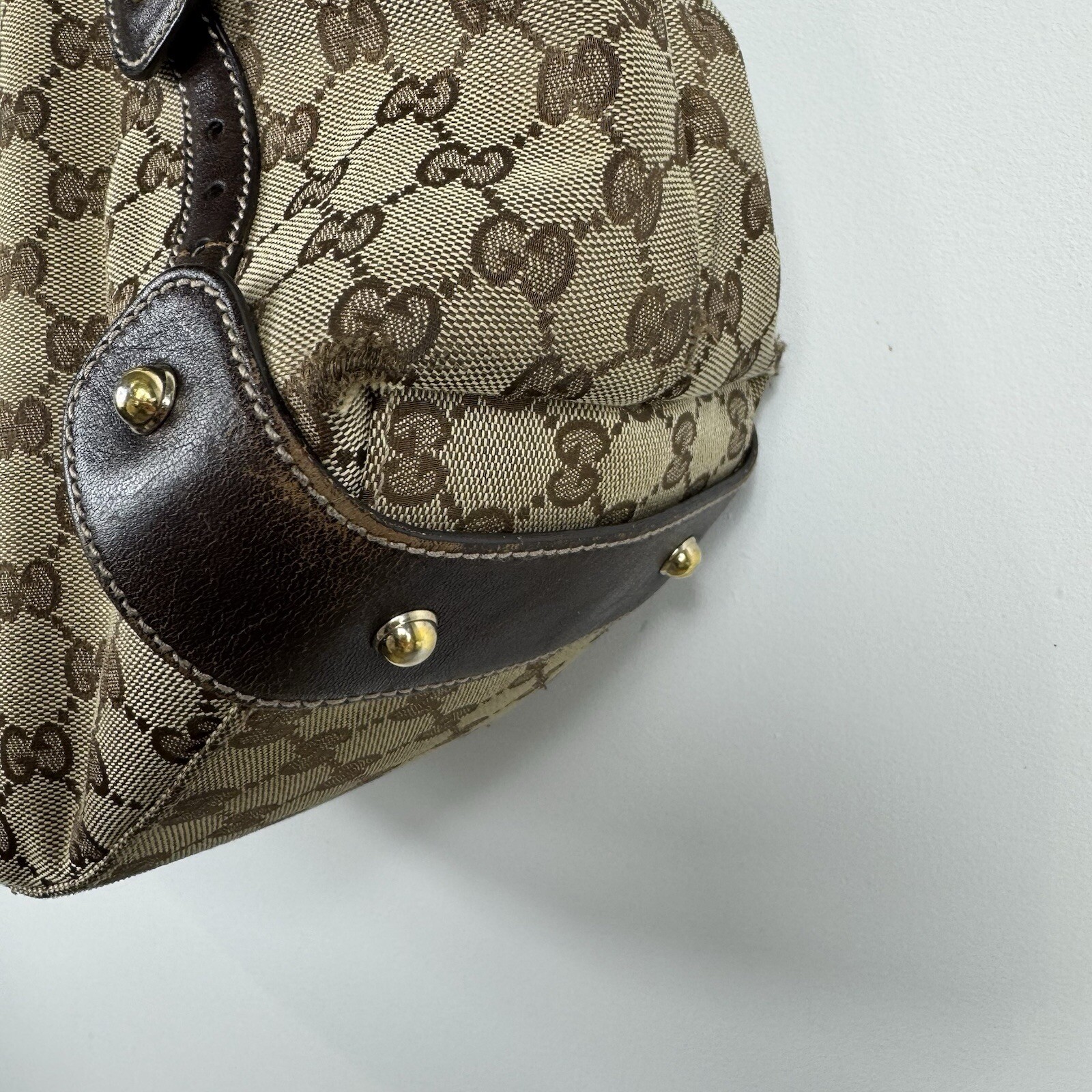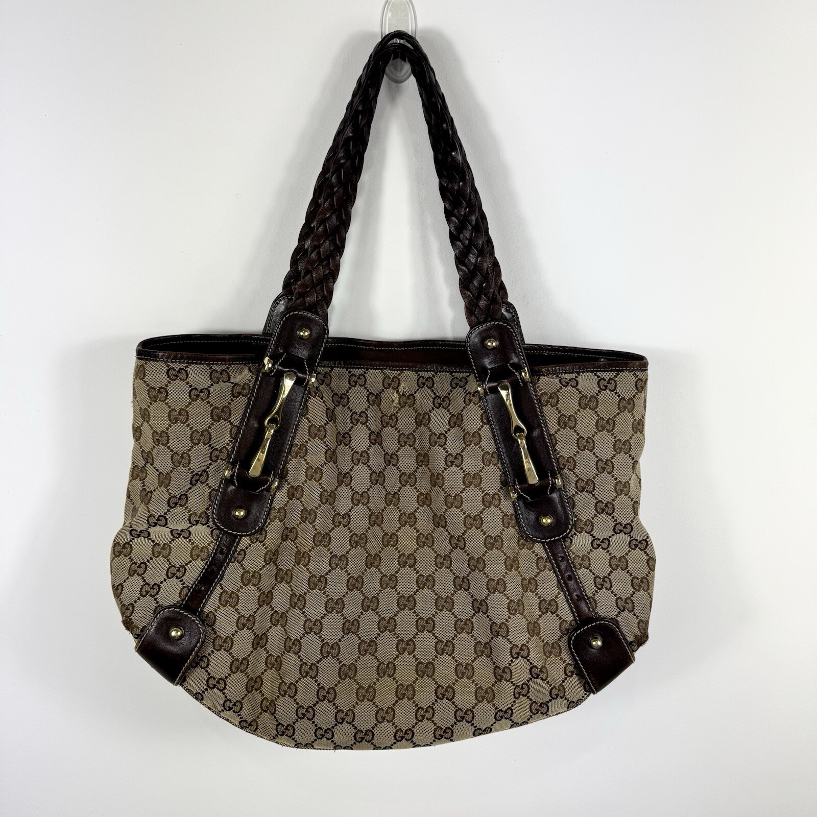 GUCCI Original canvas tote Large capacity Woven looping braided shoulder straps Gold tone horsebit hardware Interior zipper pocket Worn - scuffs, scratches surface wear, creases Inside is in immaculate condition Please note photos of all rips/tears Included: Matching wallet Original zipper wallet Needs a bit of cleaning and TLC Length: 18.75" (47 cm) Height: 12.5" (31 cm) Depth: 4.5" (11 cm) Strap Drop: 8.5" (21 cm) Made in Italy 100% authentic