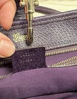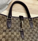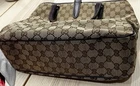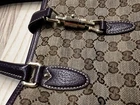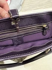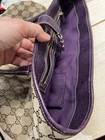 Gorgeous classic Gucci hand bag. It is made from canvas and leather. It is in brown and purple, is excellent to good condition. It has light wear/marks on trims, edges, corners, and darkened on some areas. The size is 13 x 11 x 4 inches. Made in Italy.