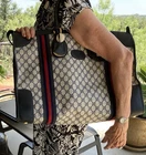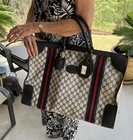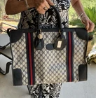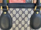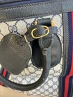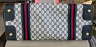 Found behind stash of luggage when getting ready for late sister’s Estate sale. This had been my mother’s house and many of her things had not been removed when my sister moved in. My mom died in 1997 age 87. She traveled a lot but hadn’t traveled in years so I’m guessing it’s from the eighties. I feel it’s authentic, as she only went on elite tours and I’m sure was taken to a legit store to shop. It looks like she bought it, wrote her name on ID card, brought it home full (2 other Gucci pieces, etc) and never used it again. Brass lock ( rusty on inside-picture), key and ID cover all in tact. Navy and red ribbon, leather (a little wear on fold/pictured) and fabric in excellent condition. Interior tag with number on underside. My mother’s name and address on back of luggage tag “Gucci” paper. White paper tag on key fob-have no idea what it means. All in all-an amazing price of vintage Gucci luggage! 20 1/2 x 14 1/2 x 9 inches (Listing handbag that matches that I’m sure was bought at same time. Also listing a navy leather purse (very used) that my sister’s notes say her husband bought for her on a trip.)