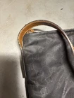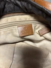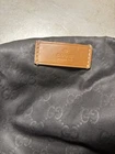 The Gucci GG Nylon Tote Shoulder Bag is a stylish and spacious accessory perfect for women on the go. Made from durable canvas in a dark brown exterior color, this shoulder bag features the iconic Gucci brand logo and a spacious interior. The size and depth of the bag may vary, but it always provides ample room for all your essentials while adding a touch of luxury to any outfit. • no tips , no damage to nylon • does need some cleaning • light discoloration and wear • rubbing around edges of trip • liner needs cleaning , staining & discoloration