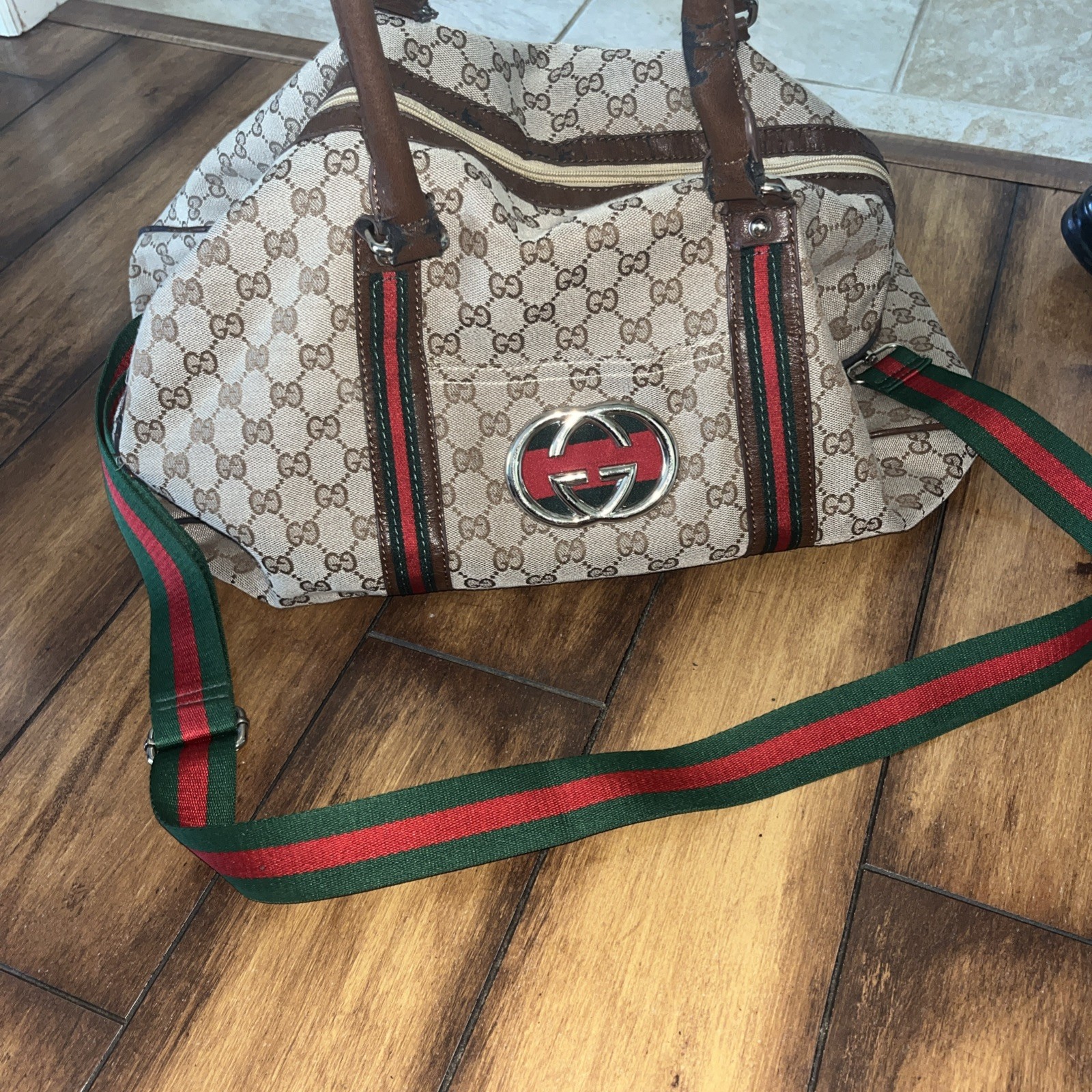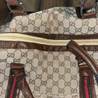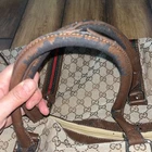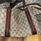 The Gucci Duffle Bag Handbag with the GG pattern and Sherry Line is a stylish and luxurious accessory for women. Made from canvas and leather, this multicolor handbag features a lined interior, perfect for keeping essentials organized while on the go. The Gucci Sherry product line adds a touch of sophistication to this duffle bag, making it a must-have piece for any fashion-forward individual looking to add a timeless and branded touch to their wardrobe. The handle is damaged as you can see in the photos, but if you are willing to get this fixed, it is a wonderful vintage piece.
