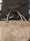 The Gucci GG Soho Medium Leather Shoulder Bag is a stylish and luxurious handbag designed for women. This rectangular-shaped bag features a medium size with a width of 13 inches, height of 12 inches, and depth of 7 inches. Made from grained leather with a beige exterior color and gold hardware accents, this designer bag adds a touch of sophistication to any outfit. The bag includes tassel accents, inner pockets, and a shoulder strap handle with a 6-inch drop for easy carrying. The Gucci GG pattern and brand logo enhance the overall appeal of this fashionable accessory.