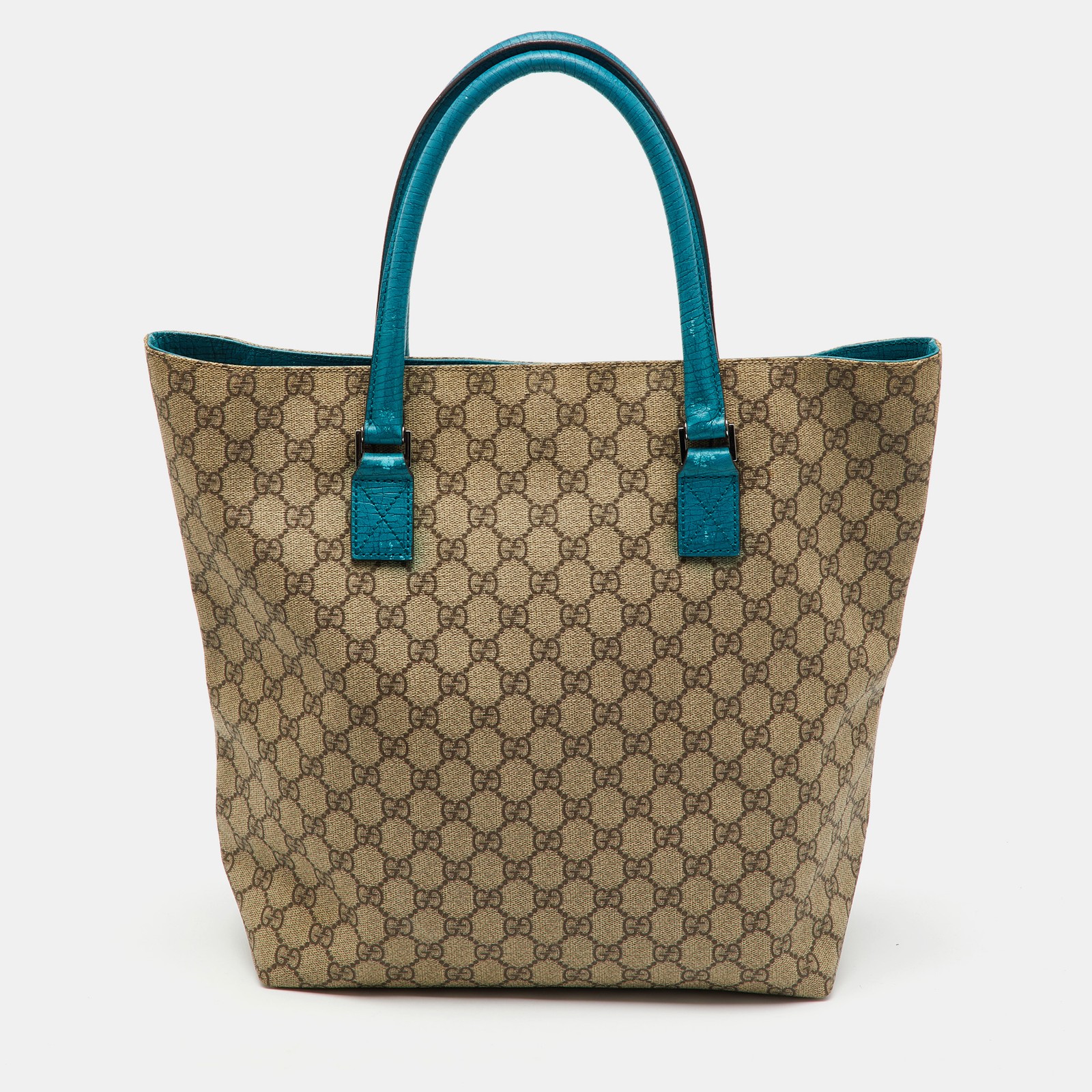 Elevate your essentials with this distinctive Gucci Vertical Tote, crafted from the house’s signature GG Supreme canvas in a refreshing beige and teal blue palette. Trimmed with smooth leather and featuring a tall, structured design, this tote offers both fashion forward charm and practical function for day to day elegance.Certified by The Luxury Closet - This item has gone through a detailed authentication process overseen by our experts. We offer a lifetime guarantee of authenticity on all our items. Import duties, taxes and charges are not included in the item price. These charges are the buyers responsibility. Please check with your country’s customs office to determine what these additional cost will be prior to buying. Our eBay Store About Us Contact Us Add to Favorite Sellers Gucci Beige/Teal Blue GG Supreme Canvas and Leather Vertical Tote $372.9 Elevate your essentials with this distinctive Gucci Vertical Tote, crafted from the house’s signature GG Supreme canvas in a refreshing beige and teal blue palette. Trimmed with smooth leather and featuring a tall, structured design, this tote offers both fashion forward charm and practical function for day to day elegance. Product Details Brand Color Beige Dimensions Material Coated Canvas, Leather Size Outsole Width Outsole Length Heel Height Includes Certified by The Luxury Closet This item has gone through a detailed authentication process overseen by our experts. We offer a lifetime guarantee of authenticity on all our items. How We Check The in-house team of experts at The Luxury Closet is highly trained to verify the authenticity and the condition of the luxury products. They ensure that only 100% authentic items are put on sale.The evaluation process is unique with its own mix of assessment criteria and differs according to the category. Each item is evaluated based on the following combination of hallmarks, hardware, stitching, symmetry, material, craftsmanship, stamping, codes, hologram stickers, and packaging. Our authenticators also check if the items have been modified or amended (e.g., aftermarket diamonds, replaced batteries, repaired bags, etc.) International Buyers Import duties, taxes and charges are not included in the item price. These charges are the buyers responsibility. Please check with your country’s customs office to determine what these additional cost will be prior to buying.
