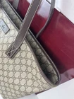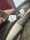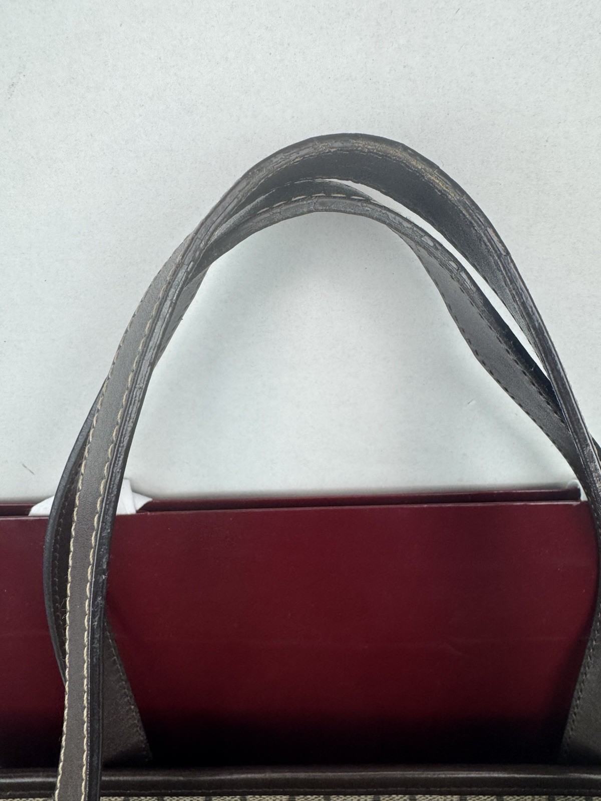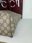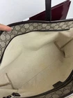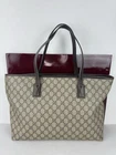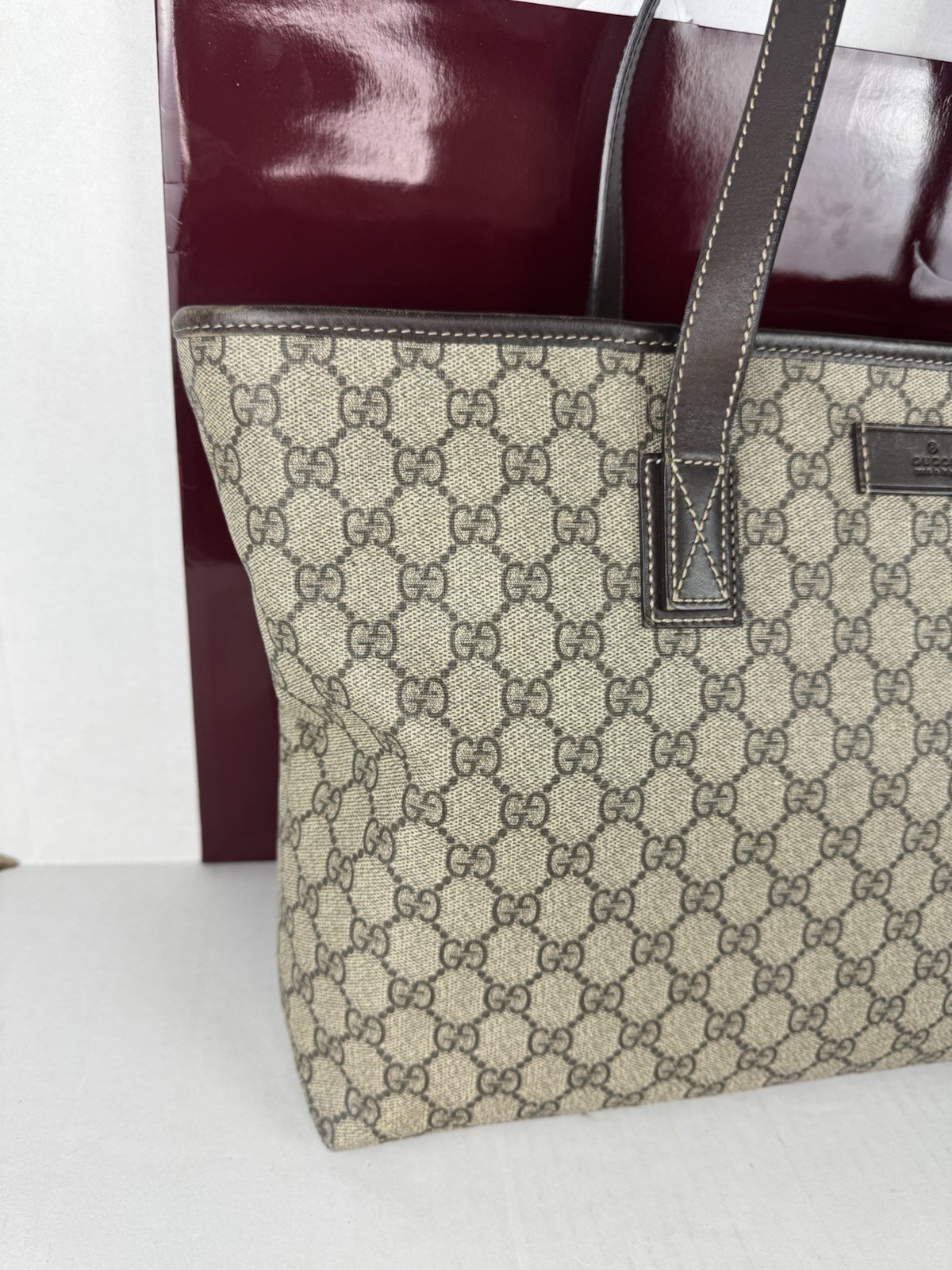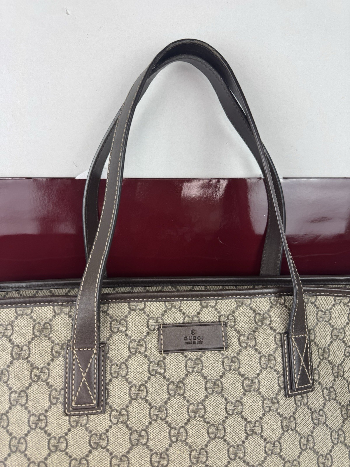 The Gucci GG Supreme Plus Tote Bag Shoulder Purse is a luxurious and stylish accessory designed for women. Made with a combination of PVC and leather in beige and dark brown colors, this tote features gold hardware accents and a brown handle/strap. The bag exudes a sense of elegance and sophistication, perfect for carrying everyday essentials in a fashionable way. With its iconic Gucci branding and high-quality materials, this purse is a statement piece that adds a touch of glam to any outfit outside of the bag cracked color faded handles cracked and dry inside little dirty ink.