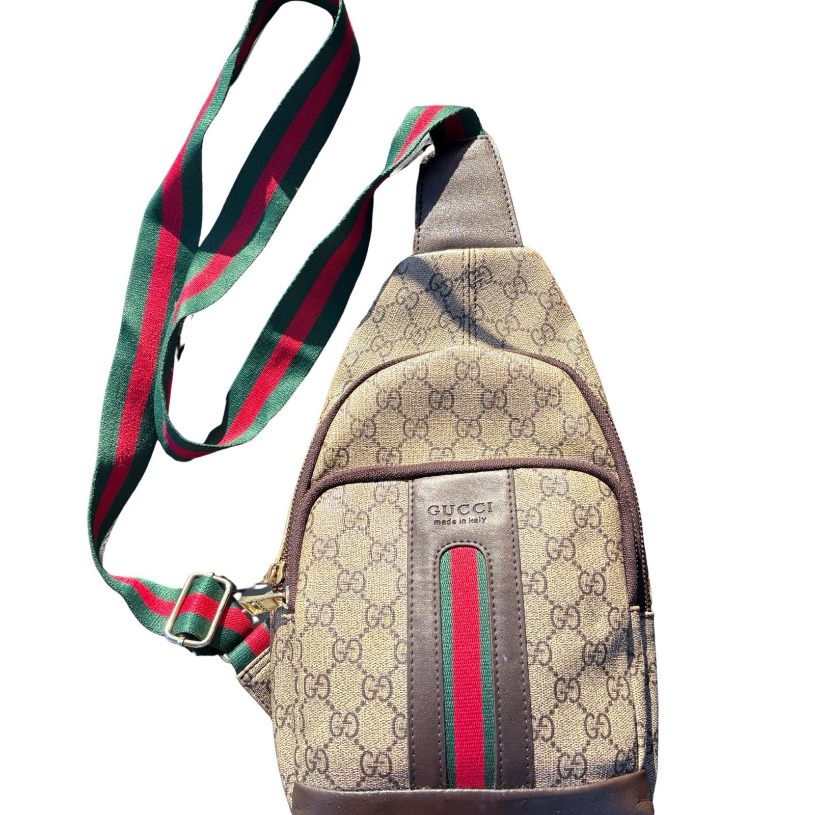 Authentic Gucci GG Supreme monogram sling / crossbody bag featuring the iconic green-red Web stripe. • Authentic Gucci “Made in Italy” leather tags • GG Supreme coated canvas • Adjustable Web shoulder strap • Zip main compartment • Brown leather trim Condition Notes: Pre-owned with visible signs of wear consistent with normal use. Wear present on corners, strap, and interior (see photos demonstrated). No structural damage; zippers function properly. Perfect for everyday use, travel, or streetwear styling. Please review all photos carefully for condition details. Item shown is the exact item you will receive. ⸻ Item Specifics • Brand: Gucci • Model: GG Supreme Sling / Crossbody • Color: Brown / Green / Red • Material: Coated Canvas & Leather • Style: Sling / Crossbody • Department: Unisex Adults • Country/Region of Manufacture: Italy • Authenticity: Guaranteed Authentic