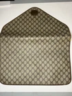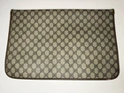 The Gucci GG Vintage Logo Portfolio Pochette is a large rectangular clutch featuring a classic Gucci GG pattern in brown leather. This vintage piece from Italy exudes luxury with gold hardware accents and a coated finish. Perfect for travel, casual outings, or business meetings, this stylish handbag embodies timeless elegance with its brown leather lining and iconic Gucci brand. The snap closure adds a touch of convenience to this sophisticated accessory.