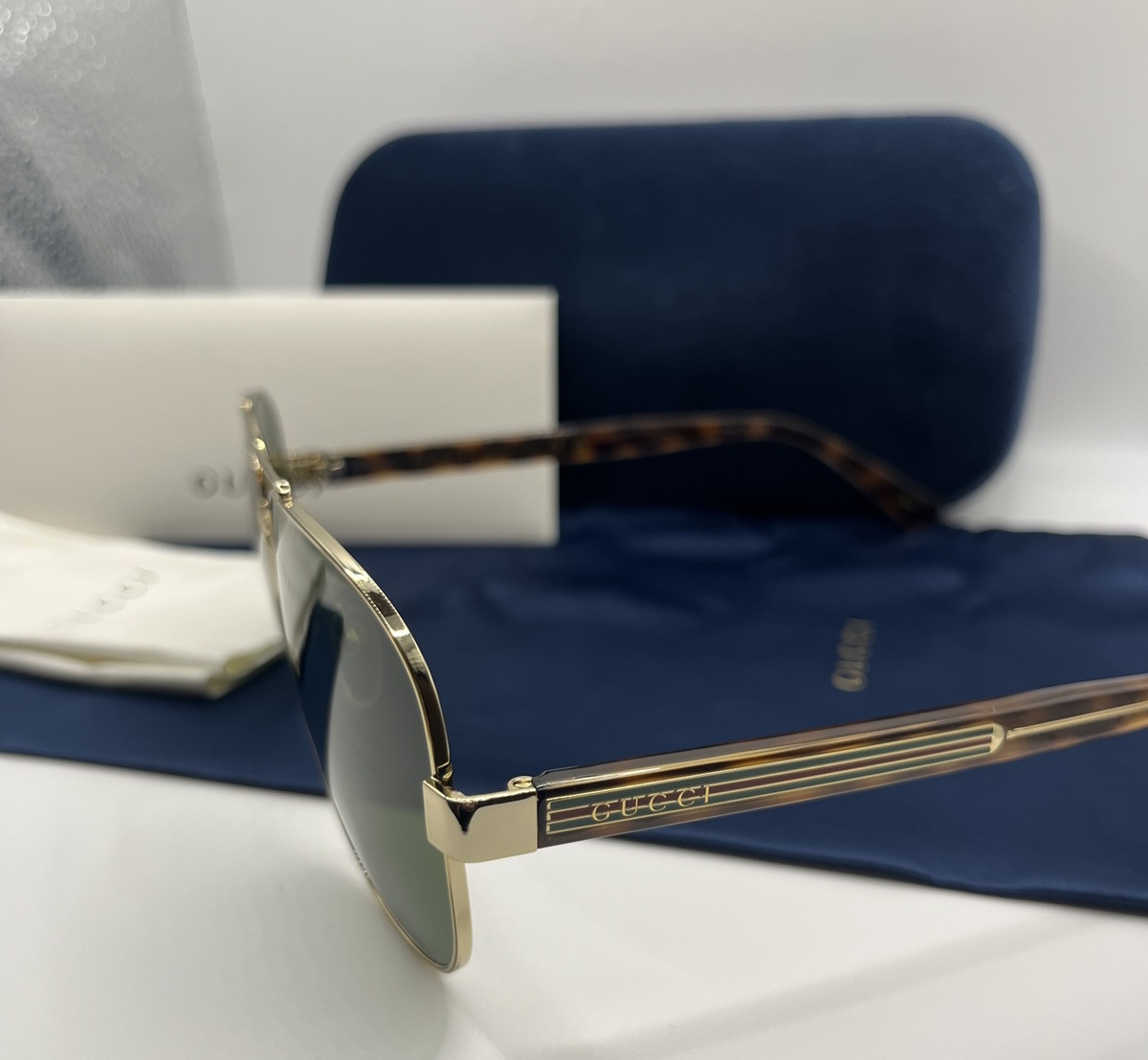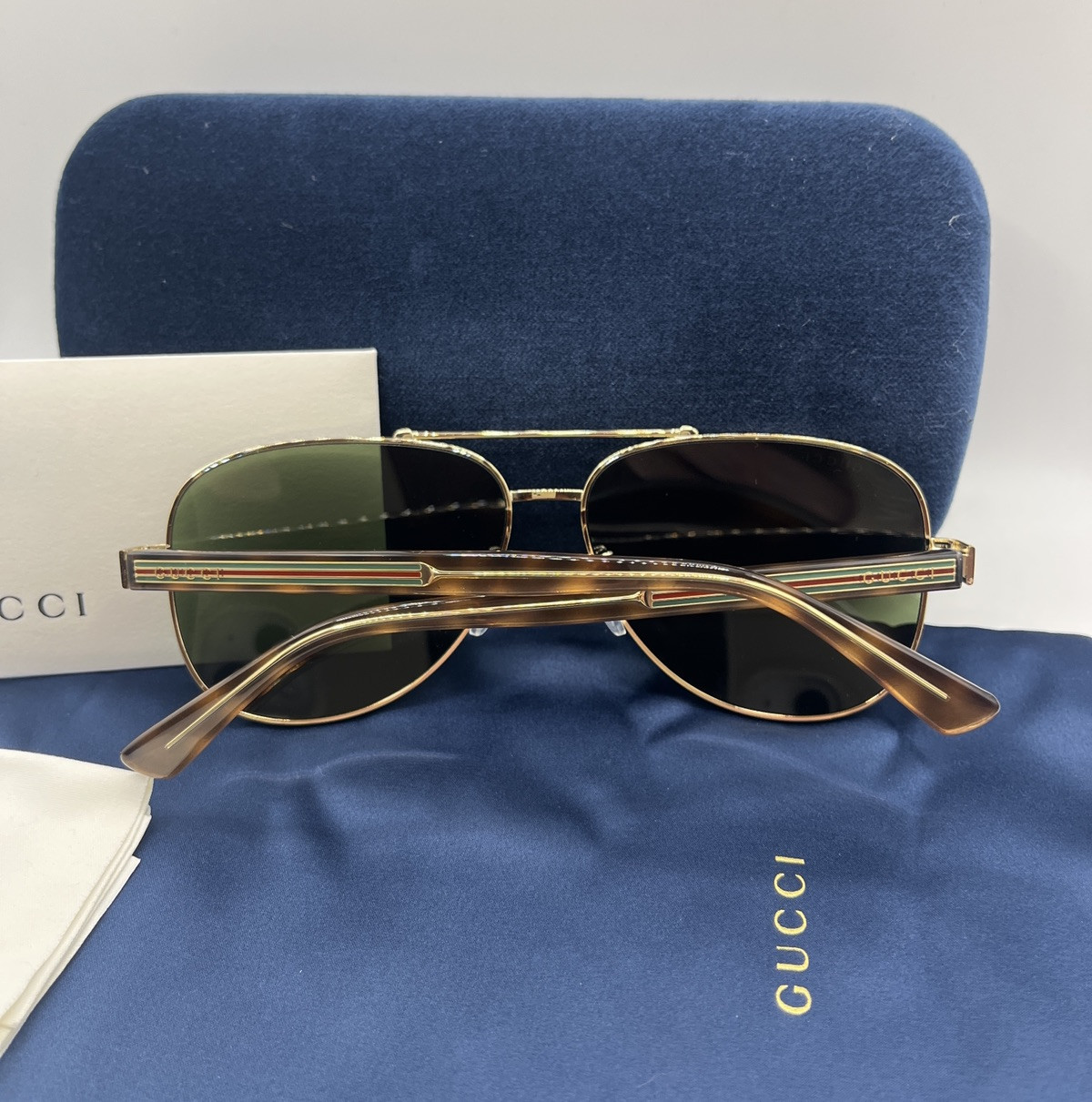 Gucci GG0528S 63/14/150mm Aviator Sunglasses with Gold/Havana Frame NEW Full Set. Condition is New with tags. Shipped with USPS Ground Advantage.