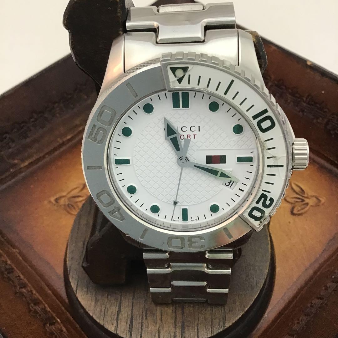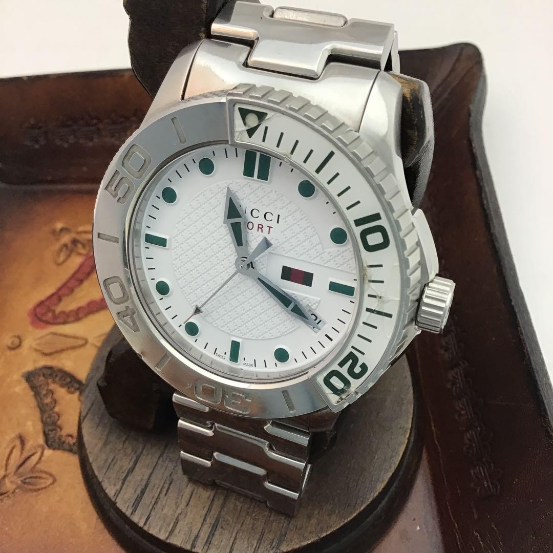 Gucci G-Time Sport 1262 Swiss Quartz Men's Watch Silver Stainless Steel Used Key Features Experience the elegance of the GUCCI G-Timeless Sports men's quartz watch, crafted in Switzerland. Featuring a sleek silver stainless steel case with a white dial, this watch measures approximately 44mm in diameter and has a lug width of 22mm. Weighing about 163g, it offers a comfortable fit with an approximate wrist circumference of 17.5cm. The watch is in used condition with minor scratches and a crack on the bezel glass at 12, 2-3, and 4 o'clock (see photos). It is fully operational and has been cleaned with alcohol. Purchased from a Tokyo pawnshop, it includes no accessories. A great choice for everyday wear or collection. Item Specifics: - C:Department: Men's - C:Type: Quartz Watch - C:Reference Number: KNORVV EPQV223 - C:Model: G-Timeless Sports - C:Features: Water Resistance - C:Movement: Quartz Specifications Brand Gucci Country Japan Product Description Gucci G-Time Sport 126.2 Made In Switzerland Bezel Glass Cracked Description If you have any questions, please feel free to contact us. I will try to answer as soon as possible. Payment Require immediate payment when buyer uses Buy It Now. Shipping Domestic Shipping(United States) Expedited shipping FreeShipping International Shipping Expedited International Flat Rate Shipping Shipping Cost : $0.00 Americas, Europe, Asia, Canada, United Kingdom, Germany, France Expedited International Flat Rate Shipping Shipping Cost : $15.00 Australia Terms of Sale International BuyersPlease Note: Import duties, taxes and charges are not included in the item price or shipping charges.These charges are the buyer's responsibility.Please check with your country's customs office to determine what these additional costs will be prior to bidding/buying.These charges are normally collected by the delivering freight (shipping) company or when you pick the item up - do not confuse them for additional shipping charges.We do not mark merchandise values below value or mark items as "gifts" - US and International government regulations prohibit such behavior. International Buyers - Please Note: Import duties, taxes, and charges are not included in the item price or shipping cost. These charges are the buyer's responsibility. Please check with your country's customs office to determine what these additional costs will be prior to bidding or buying.