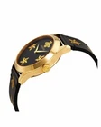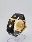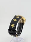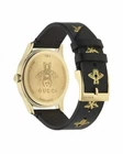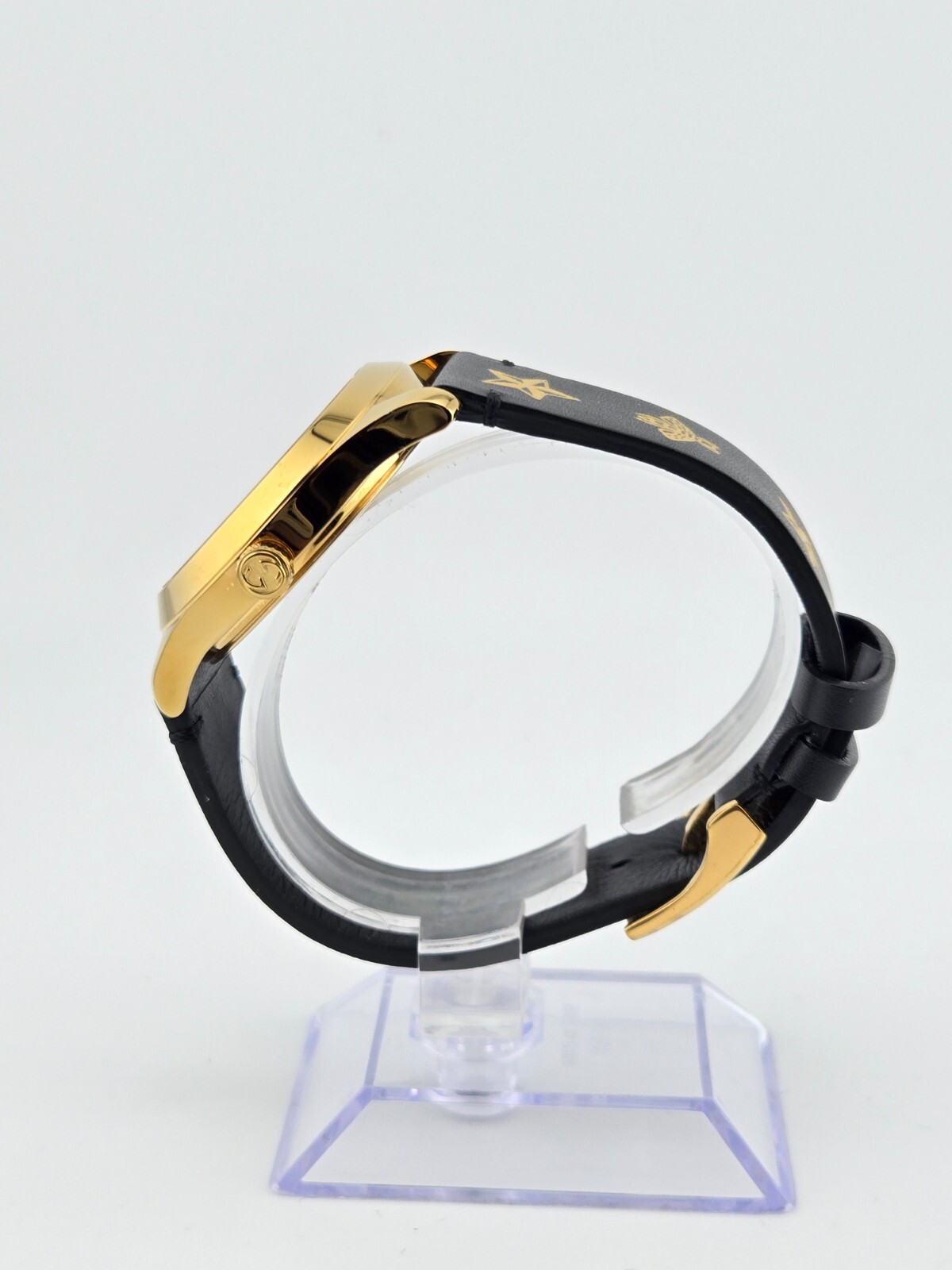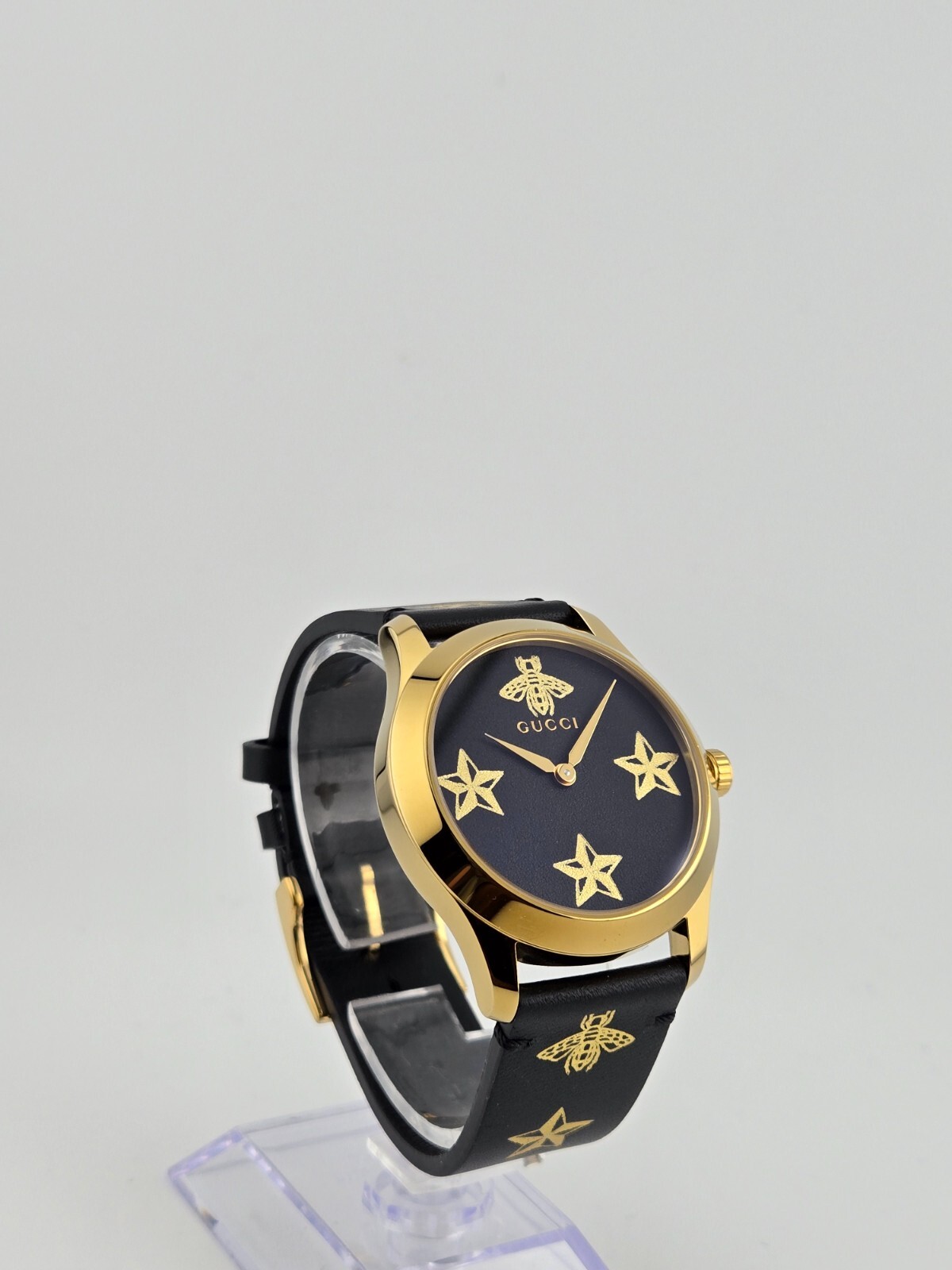 Gucci Women's G-Timeless Black Dial Leather Strap Watch - YA1264055 ($1100 MSRP) With Original Box! This watch is a Shelf Pull from one of the Major Department Stores. Watch has scratches on the watch case/band. The Gucci Women's G-Timeless Black Dial Leather Strap Watch - YA1264055 is a stunning fusion of luxury and modern design, perfect for the stylish woman. Encased in a yellow gold PVD stainless steel case, this watch exudes sophistication and elegance, making it an ideal accessory for any occasion. The fixed yellow gold PVD bezel complements the black leather strap beautifully, creating a striking contrast that elevates its overall aesthetic. At the heart of this timepiece lies a captivating black dial adorned with a unique star and bee motif, showcasing Gucci’s iconic symbols. The yellow gold-tone hands gracefully move across the dial, which features star motifs at the 3, 6, and 9 o'clock positions, adding an artistic touch. With a case size of 38 mm and a thickness of 10 mm, this watch strikes a perfect balance between presence and wearability. The Ronda quartz movement ensures precise timekeeping, while the scratch-resistant sapphire crystal provides durability and clarity. Designed for everyday elegance, this watch is water-resistant up to 50 meters (165 feet), making it suitable for various activities without sacrificing style. The easy-to-use pull/push crown and solid case back enhance its robust construction, while the 20 mm band width and tang clasp ensure a comfortable fit. Whether dressing up for a night out or adding a touch of luxury to your everyday look, the Gucci G-Timeless watch is the perfect companion for the fashion-forward woman. Features Yellow gold PVD stainless steel case with a black leather strap. Fixed yellow gold PVD bezel. Black (star and bee motif) dial with yellow gold-tone hands. Star motif appears at the 3, 6 amd 9 o'clock positions. Dial Type: Analog. Ronda quartz movement. Scratch resistant sapphire crystal. Pull / push crown. Solid case back. Round case shape. Case size: 38 mm. Case thickness: 10 mm. Band width: 20 mm. Tang clasp. Water resistant at 50 meters / 165 feet. Functions: hour, minute. Fast and Free Shipping You're already purchasing the item. Why pay additional for shipping, especially slow shipping? We get your order shipped out within 1-business day and delivered to your doorstep as quickly as possible. Competitive Pricing With our dynamic pricing model, our prices are always competitive. Our prices are some of the lowest that you will find on the internet. Rest assured that you're getting a good deal when purchasing with us. 30-day Money Back Guarantee We are committed to making sure that you leave this transaction satisfied. If you're unhappy with the product for any reason, you may return it back for your money-back or a replacement within 30 days. No questions asked!