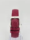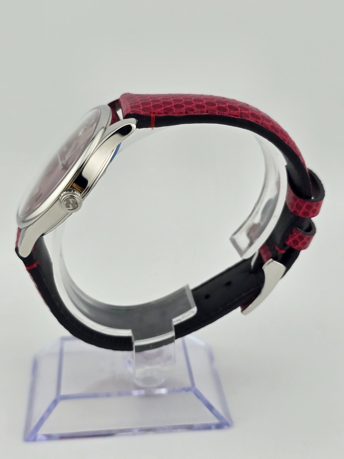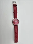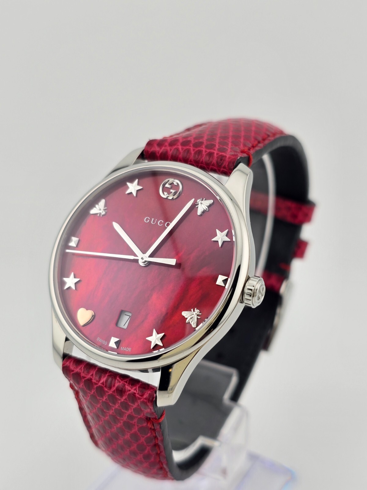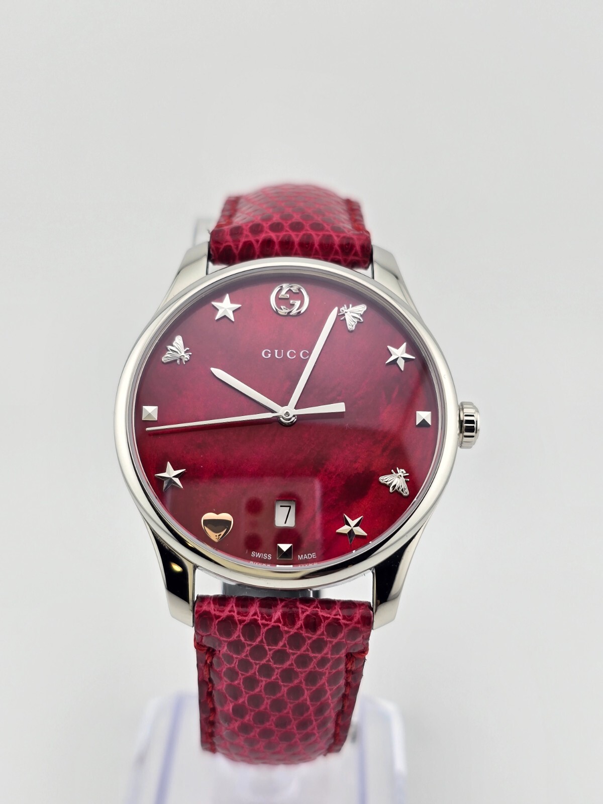 Gucci Women’s G-Timeless Cherry Red Ladies Watch - YA1264041 ($1380 MSRP) New with Original Box and Tags! This watch is a Shelf Pull from one of the Major Department Stores. May find few micro scratches on the watch case/band, visible under a direct and strong light. Introducing the Gucci Women’s G-Timeless Cherry Red Ladies Watch (model YA1264041), a striking and fashionable accessory that epitomizes luxury and style. This exquisite timepiece is designed to make a bold statement while offering reliable functionality. The watch features a polished stainless steel case paired with a vibrant cherry red lizard leather strap, creating a captivating contrast that enhances its overall appeal. The fixed stainless steel bezel frames the elegant cherry red mother of pearl dial, which shimmers with sophistication. Silver-tone hands glide smoothly over the dial, while distinctive Gucci charm hour markers add a unique and stylish touch. This analog watch is powered by a precise quartz movement, ensuring accurate timekeeping. The dial also includes a convenient date display located just above the 6 o'clock position, adding to its practicality. The scratch-resistant sapphire crystal protects the dial, ensuring durability and clarity over time. The watch boasts a solid case back and a round case shape with a diameter of 36 mm and a slender thickness of 7 mm, offering a comfortable and elegant fit on the wrist. The cherry red lizard leather strap has a band width of 17 mm and is secured with a tang clasp, providing a secure and adjustable fit. Designed to withstand daily wear, this timepiece is water-resistant up to 50 meters (165 feet), making it suitable for short periods of recreational swimming and general exposure to water, though it is not recommended for diving or snorkeling. In summary, the Gucci Women’s G-Timeless Cherry Red Ladies Watch (YA1264041) is a luxurious and eye-catching accessory that combines bold design with reliable functionality. Its stunning cherry red mother of pearl dial, unique Gucci charm hour markers, and high-quality materials make it a perfect choice for the modern, fashion-forward woman. With its precise quartz movement and elegant design, this watch is an excellent addition to any collection. Features Stainless steel case with a cherry red (lizard) leather strap. Fixed stainless steel bezel. Cherry red mother of pearl dial with silver-tone hands and Gucci charms hour markers. Dial Type: Analog. Date display above the 6 o'clock position. Quartz movement. Scratch resistant sapphire crystal. Pull / push crown. Solid case back. Round case shape. Case size: 36 mm. Case thickness: 7 mm. Band width: 17 mm. Tang clasp. Water resistant at 50 meters / 165 feet. Functions: date, hour, minute, second Fast and Free Shipping You're already purchasing the item. Why pay additional for shipping, especially slow shipping? We get your order shipped out within 1-business day and delivered to your doorstep as quickly as possible. Competitive Pricing With our dynamic pricing model, our prices are always competitive. Our prices are some of the lowest that you will find on the internet. Rest assured that you're getting a good deal when purchasing with us. 30-day Money Back Guarantee We are committed to making sure that you leave this transaction satisfied. If you're unhappy with the product for any reason, you may return it back for your money-back or a replacement within 30 days. No questions asked!