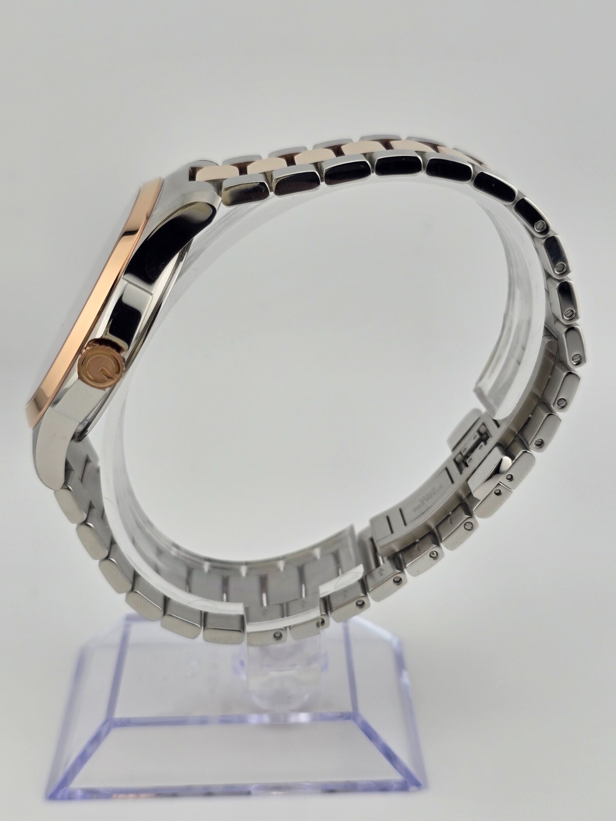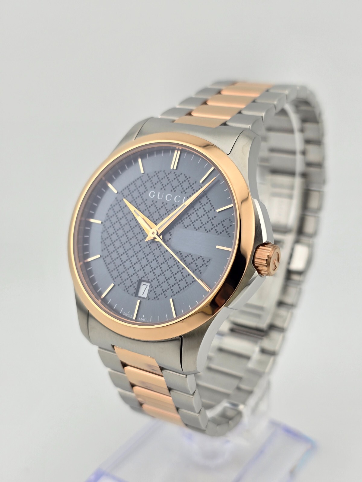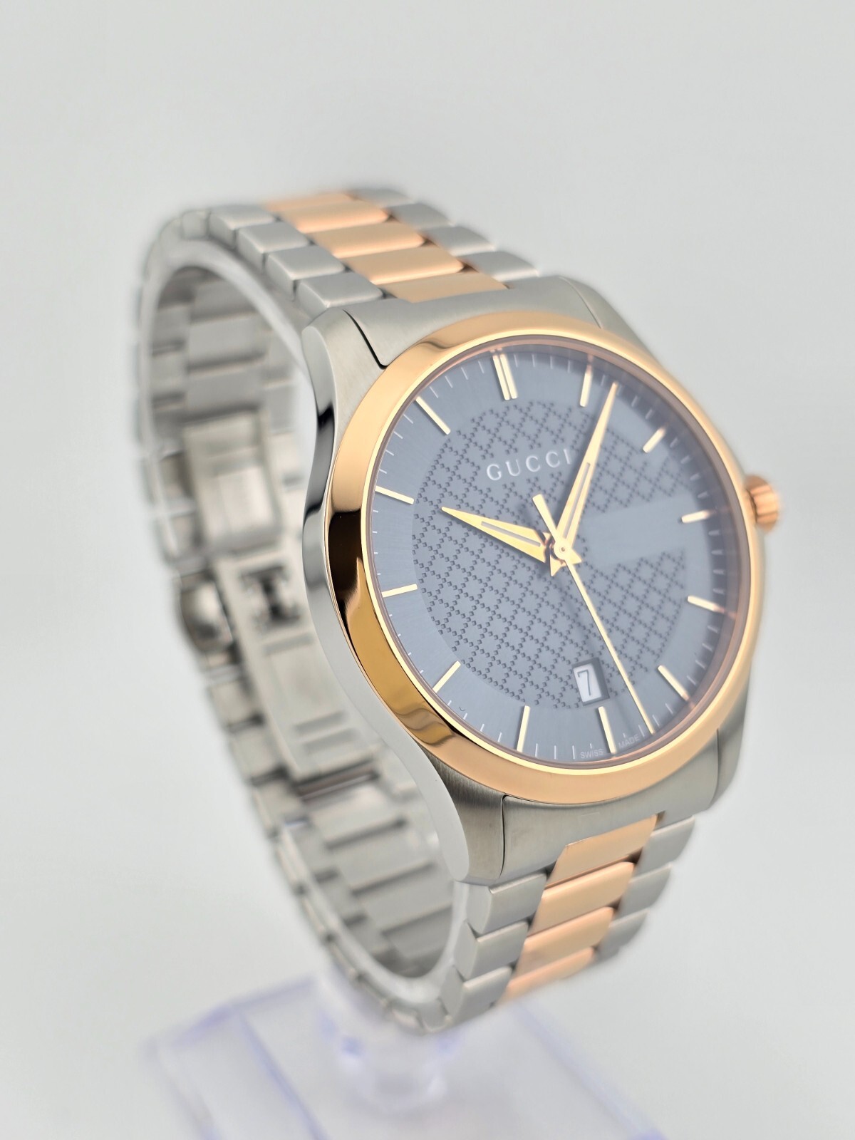 Gucci Men's G-Timeless Gray Dial Rose Gold Tone Watch - YA126446 ($1170 MSRP) With Original Box! This watch is a Shelf Pull from one of the Major Department Stores. Watch has micro scratches on the watch case/band, visible under direct light. Synonymous with glamour and refinement, Gucci offer this polished watch from the G-Timeless collection. Manufactured in Switzerland but with an Italian-born edge, this watch will seduce the style-conscious man with its beautiful charcoal round dial rose gold hands, index hour markers and an easy-to-read date at 6 o'clock. A diamond-shaped pattern adds a twist to the dial without compromising on sophistication. The watch is powered by a quartz mechanism and features a polished silver stainless steel case with a rose gold-plated bezel. The elegant desk-to-dinner timepiece fastens with a silver stainless steel bracelet strap with polished rose gold-plated links and a deployment clasp. Features Stainless steel case with a two-tone (silver and rose gold PVD) bracelet. Fixed rose gold PVD bezel. Gray dial with luminous rose gold-tone hands and index hour markers. Minute markers around the outer rim. Dial Type: Analog. Date display above the 6 o'clock position. Quartz movement. Scratch resistant sapphire crystal. Pull / push crown. Solid case back. Case size: 38 mm. Case thickness: 7 mm. Round case shape. Band width: 20 mm. Deployment clasp. Water resistant at 50 meters / 165 feet. Functions: date, hour, minute, second Fast and Free Shipping You're already purchasing the item. Why pay additional for shipping, especially slow shipping? We get your order shipped out within 1-business day and delivered to your doorstep as quickly as possible. Competitive Pricing With our dynamic pricing model, our prices are always competitive. Our prices are some of the lowest that you will find on the internet. Rest assured that you're getting a good deal when purchasing with us. 30-day Money Back Guarantee We are committed to making sure that you leave this transaction satisfied. If you're unhappy with the product for any reason, you may return it back for your money-back or a replacement within 30 days. No questions asked!