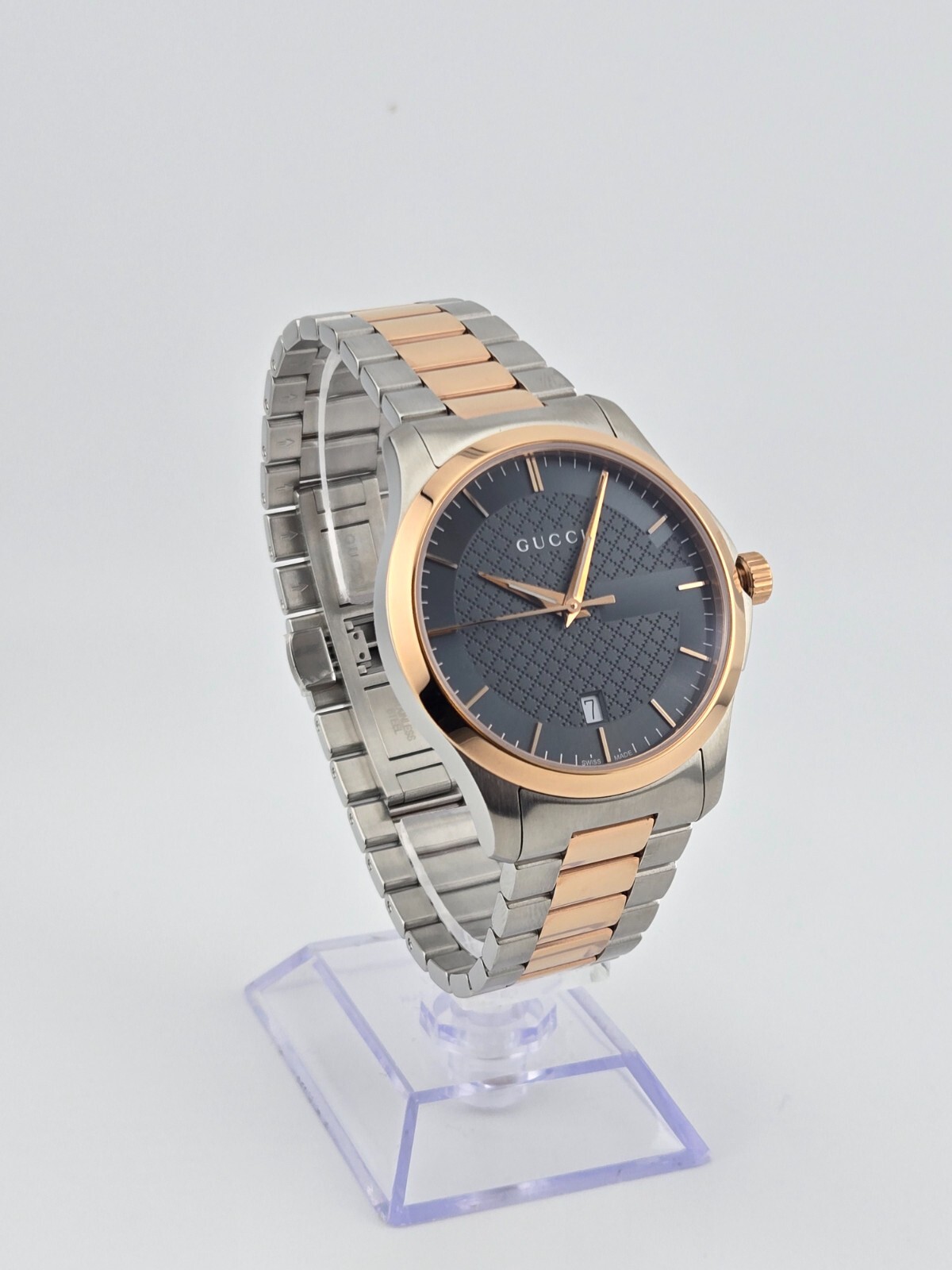 $1170 MSRP | Gucci Men's G-Timeless Two-Tone Grey Dial Watch - YA126446 The Gucci Men’s G-Timeless Grey Dial Two-Tone Watch (YA126446) offers a sophisticated and elegant look that effortlessly combines luxury and functionality. Featuring a stainless steel case with a striking two-tone design—silver and rose gold PVD—this watch exudes modern style. The fixed rose gold PVD bezel further enhances the watch's refined aesthetic, while the slim 7mm case thickness adds to its sleek profile. With a 38mm round case, it’s the perfect size for a classic and timeless appearance. The grey dial of this timepiece is complemented by luminous rose gold-tone hands and index hour markers, ensuring readability in any light. Minute markers around the outer rim add extra precision to the design. A date display is positioned just above the 6 o'clock mark, making it both practical and stylish. Powered by reliable quartz movement, this watch provides accurate timekeeping with the functions of hour, minute, second, and date. Built to last, the Gucci G-Timeless Watch features a scratch-resistant sapphire crystal, offering durability and long-lasting clarity. The watch is equipped with a pull/push crown for ease of use and a solid case back for enhanced durability. With water resistance up to 50 meters (165 feet), this timepiece is versatile enough for everyday wear. The 20mm band width and deployment clasp ensure a secure and comfortable fit. Whether for casual or formal occasions, this watch brings a refined touch to any outfit. Features Stainless steel case with a two-tone (silver and rose gold PVD) bracelet. Fixed rose gold PVD bezel. Grey dial with luminous rose gold-tone hands and index hour markers. Minute markers around the outer rim. Dial Type: Analog. Date display above the 6 o'clock position. Quartz movement. Scratch resistant sapphire crystal. Pull / push crown. Solid case back. Case size: 38 mm. Case thickness: 7 mm. Round case shape. Band width: 20 mm. Deployment clasp. Water resistant at 50 meters / 165 feet. Functions: date, hour, minute, second Fast and Free Shipping You're already purchasing the item. Why pay additional for shipping, especially slow shipping? We get your order shipped out within 1-business day and delivered to your doorstep as quickly as possible. Competitive Pricing With our dynamic pricing model, our prices are always competitive. Our prices are some of the lowest that you will find on the internet. Rest assured that you're getting a good deal when purchasing with us. 30-day Money Back Guarantee We are committed to making sure that you leave this transaction satisfied. If you're unhappy with the product for any reason, you may return it back for your money-back or a replacement within 30 days. No questions asked!