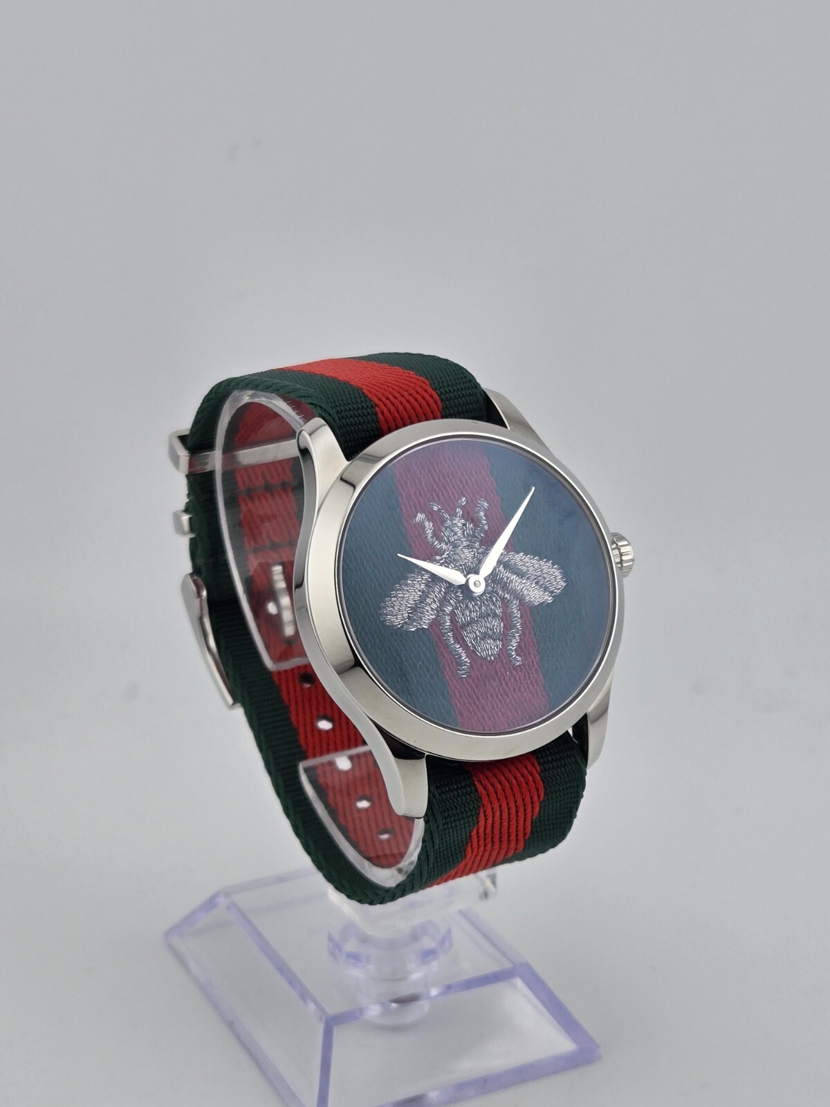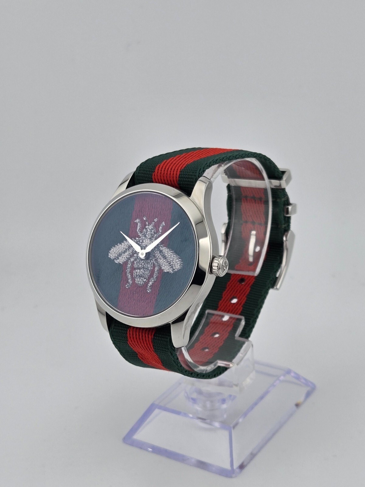 Gucci G-Timeless Men's Red and Green Dial Quartz Watch YA1264148 ($950 MSRP) With Original Box! This watch is a Shelf Pull from one of the Major Department Stores. Watch has micro scratches on the watch case/band, visible under direct light. Founded in Florence in 1921, GUCCI is one of the world's leading luxury fashion brands. Combining timeless style and contemporary fashion in a unique way. With an incredible level of craftsmanship and an eye for detail, these Gucci timepieces will help you keep track of time, in fine Italian style. This Gucci G-Timeless Unisex Watch features a 38mm Stainless Steel case, showcasing a Green dial and sapphire crystal glass. Powered by a quartz movement, this stunning watch also showcases a nylon strap finished with a buckle clasp for added security. This timepiece is also water resistant to 30 Meters. Features Stainless steel case with a green and red stripe nylon strap. Fixed stainless steel bezel. Red and green stripe (bee motif) dial with silver-tone hands. No markers. Dial Type: Analog. Ronda 762 quartz movement. Scratch resistant mineral crystal. Pull / push crown. Solid case back. Round case shape. Case size: 38 mm. Tang clasp. Water resistant at 50 meters / 165 feet. Functions: hour, minute. G-timeless Series. Casual watch style. Fast and Free Shipping You're already purchasing the item. Why pay additional for shipping, especially slow shipping? We get your order shipped out within 1-business day and delivered to your doorstep as quickly as possible. Competitive Pricing With our dynamic pricing model, our prices are always competitive. Our prices are some of the lowest that you will find on the internet. Rest assured that you're getting a good deal when purchasing with us. 30-day Money Back Guarantee We are committed to making sure that you leave this transaction satisfied. If you're unhappy with the product for any reason, you may return it back for your money-back or a replacement within 30 days. No questions asked!