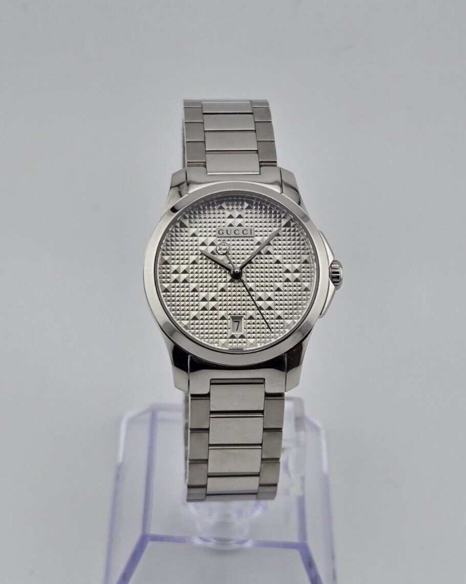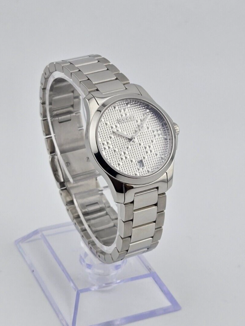 Gucci G-Timeless Women's Stainless Steel Swiss Watch - YA126551 ($790 MSRP) New with Original Box and Tags! This watch is a Shelf Pull from one of the Major Department Stores. May find few micro scratches on the watch case/band, visible under a direct and strong light. The Gucci G-Timeless Women's Stainless Steel Swiss Watch (Model: YA126551) is an elegant and versatile timepiece that embodies timeless sophistication. Featuring a durable stainless steel case and bracelet, this watch has a sleek and polished appearance that complements both casual and formal attire. The fixed stainless steel bezel frames the silver diamante dial, which is accentuated by silver-tone hands for a refined, understated look. A date display at the 6 o'clock position adds practical functionality, while the analog dial enhances its classic appeal. Powered by precise quartz movement, the Gucci G-Timeless Women's Watch ensures reliable timekeeping. Its scratch-resistant sapphire crystal protects the dial from daily wear, maintaining clarity and durability over time. With a 27 mm round case and a solid case back, this timepiece offers a comfortable fit while retaining a sleek, compact profile that is perfect for the modern woman. This watch also features a deployment clasp with a push-button release for secure and easy wear. Water-resistant to 50 meters (165 feet), it can withstand splashes and brief submersion, making it suitable for everyday use. The Gucci G-Timeless Women's Stainless Steel Swiss Watch (YA126551) combines functionality with luxury, making it an ideal accessory for those who appreciate elegance and practicality in their timepieces. Features Stainless steel case with a stainless steel bracelet. Fixed stainless steel bezel. Silver diamante dial with silver-tone hands. Dial Type: Analog. Date display at the 6 o'clock position. Quartz movement. Scratch resistant sapphire crystal. Solid case back. Case size: 27 mm. Round case shape. Deployment clasp with a push button release. Water resistant at 50 meters / 165 feet. Functions: date, hour, minute, second. Fast and Free Shipping You're already purchasing the item. Why pay additional for shipping, especially slow shipping? We get your order shipped out within 1-business day and delivered to your doorstep as quickly as possible. Competitive Pricing With our dynamic pricing model, our prices are always competitive. Our prices are some of the lowest that you will find on the internet. Rest assured that you're getting a good deal when purchasing with us. 30-day Money Back Guarantee We are committed to making sure that you leave this transaction satisfied. If you're unhappy with the product for any reason, you may return it back for your money-back or a replacement within 30 days. No questions asked!