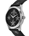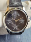 Gucci Women’s G-Timeless Black Dial Bee and Star Watch - YA1264105 ($920 MSRP) With Original Box! This watch is a Shelf Pull from one of the Major Department Stores. Watch has scratches on the watch case/band. Established in 1921 by Guccio Gucci, the Italian fashion brand Gucci not only offers luxury bags, clothes, footwear, accessories, perfume, and beauty products but also provides some of the world’s finest watches. Offering exquisite Italian craftsmanship fused with Swiss technology — from delicate dress watches for women to robust dive watches for men, Gucci earns the trust not only of fashion aficionados but also serious watch enthusiasts. The Gucci Women’s G-Timeless Black Dial Bee and Star Watch - YA1264105 is a perfect blend of elegance and sophistication. It features a stainless steel case paired with a unique black leather strap adorned with bee and star prints. The fixed stainless steel bezel frames a black dial with silver-tone alpha-style hands and no markers, save for the iconic Gucci bee logo at the 12 o'clock position. This analog watch is powered by a precise quartz movement and is protected by a scratch-resistant sapphire crystal. Designed for both durability and style, the watch boasts a pull/push crown, a solid case back, and a round case shape with a diameter of 38 mm and a thickness of 8 mm. The band, which has a width of 20 mm, is secured with a tang clasp. Water-resistant up to 50 meters (165 feet), this dress watch is suitable for everyday wear. The Gucci Women’s G-Timeless Watch is a testament to the brand’s commitment to creating timeless, high-quality timepieces that seamlessly combine fashion and functionality. Features Stainless steel case with a black (bee and star print) leather strap. Fixed stainless steel bezel. Black (star print) dial with silver-tone alpha-style hands. No markers. The Gucci bee logo appears at 12 o'clock position. Dial Type: Analog. Quartz movement. Scratch resistant sapphire crystal. Pull / push crown. Solid case back. Round case shape. Case size: 38 mm. Case thickness: 8 mm. Band width: 20 mm. Tang clasp. Water resistant at 50 meters / 165 feet. Functions: hour, minute. Fast and Free Shipping You're already purchasing the item. Why pay additional for shipping, especially slow shipping? We get your order shipped out within 1-business day and delivered to your doorstep as quickly as possible. Competitive Pricing With our dynamic pricing model, our prices are always competitive. Our prices are some of the lowest that you will find on the internet. Rest assured that you're getting a good deal when purchasing with us. 30-day Money Back Guarantee We are committed to making sure that you leave this transaction satisfied. If you're unhappy with the product for any reason, you may return it back for your money-back or a replacement within 30 days. No questions asked!