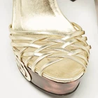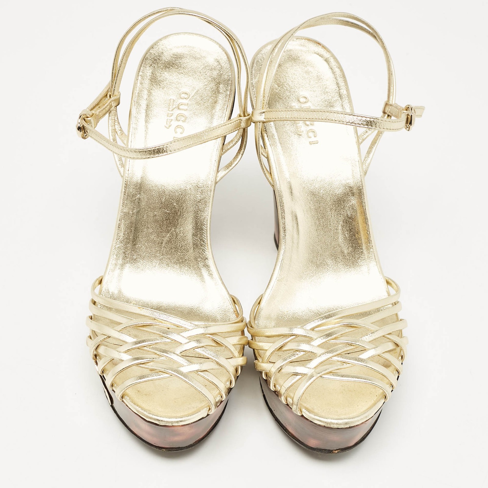 Straps in gold leather have been used to form this gorgeous pair by Gucci. The twist design, open toes, and buckled ankle straps are added to frame your feet in an alluring way.Certified by The Luxury Closet - This item has gone through a detailed authentication process overseen by our experts. We offer a lifetime guarantee of authenticity on all our items. Import duties, taxes and charges are not included in the item price. These charges are the buyers responsibility. Please check with your country’s customs office to determine what these additional cost will be prior to buying. Our eBay Store About Us Contact Us Add to Favorite Sellers Gucci Gold Leather Platform Ankle Strap Sandals Size 38 $137.5 Straps in gold leather have been used to form this gorgeous pair by Gucci. The twist design, open toes, and buckled ankle straps are added to frame your feet in an alluring way. Product Details Brand Color Gold Dimensions Material Leather Size 38 Outsole Width 7 cm Outsole Length 21 cm Heel Height 15 cm Includes Original Dustbag Certified by The Luxury Closet This item has gone through a detailed authentication process overseen by our experts. We offer a lifetime guarantee of authenticity on all our items. How We Check The in-house team of experts at The Luxury Closet is highly trained to verify the authenticity and the condition of the luxury products. They ensure that only 100% authentic items are put on sale.The evaluation process is unique with its own mix of assessment criteria and differs according to the category. Each item is evaluated based on the following combination of hallmarks, hardware, stitching, symmetry, material, craftsmanship, stamping, codes, hologram stickers, and packaging. Our authenticators also check if the items have been modified or amended (e.g., aftermarket diamonds, replaced batteries, repaired bags, etc.) International Buyers Import duties, taxes and charges are not included in the item price. These charges are the buyers responsibility. Please check with your country’s customs office to determine what these additional cost will be prior to buying.