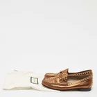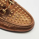 Fierce and flamboyant, these Gucci slip on loafers are rendered in gleaming gold leather and punctuated with sharp spike embellishments. A daring twist on a classic silhouette, they embody bold luxury with unapologetic attitude.Certified by The Luxury Closet - This item has gone through a detailed authentication process overseen by our experts. We offer a lifetime guarantee of authenticity on all our items. Import duties, taxes and charges are not included in the item price. These charges are the buyers responsibility. Please check with your country’s customs office to determine what these additional cost will be prior to buying. Our eBay Store About Us Contact Us Add to Favorite Sellers Gucci Gold Leather Spike Embellished Slip On Loafers Size 38 $412.5 Fierce and flamboyant, these Gucci slip on loafers are rendered in gleaming gold leather and punctuated with sharp spike embellishments. A daring twist on a classic silhouette, they embody bold luxury with unapologetic attitude. Product Details Brand Color Gold Dimensions Material Leather Size 38 Outsole Width Outsole Length Heel Height Includes Certified by The Luxury Closet This item has gone through a detailed authentication process overseen by our experts. We offer a lifetime guarantee of authenticity on all our items. How We Check The in-house team of experts at The Luxury Closet is highly trained to verify the authenticity and the condition of the luxury products. They ensure that only 100% authentic items are put on sale.The evaluation process is unique with its own mix of assessment criteria and differs according to the category. Each item is evaluated based on the following combination of hallmarks, hardware, stitching, symmetry, material, craftsmanship, stamping, codes, hologram stickers, and packaging. Our authenticators also check if the items have been modified or amended (e.g., aftermarket diamonds, replaced batteries, repaired bags, etc.) International Buyers Import duties, taxes and charges are not included in the item price. These charges are the buyers responsibility. Please check with your country’s customs office to determine what these additional cost will be prior to buying.