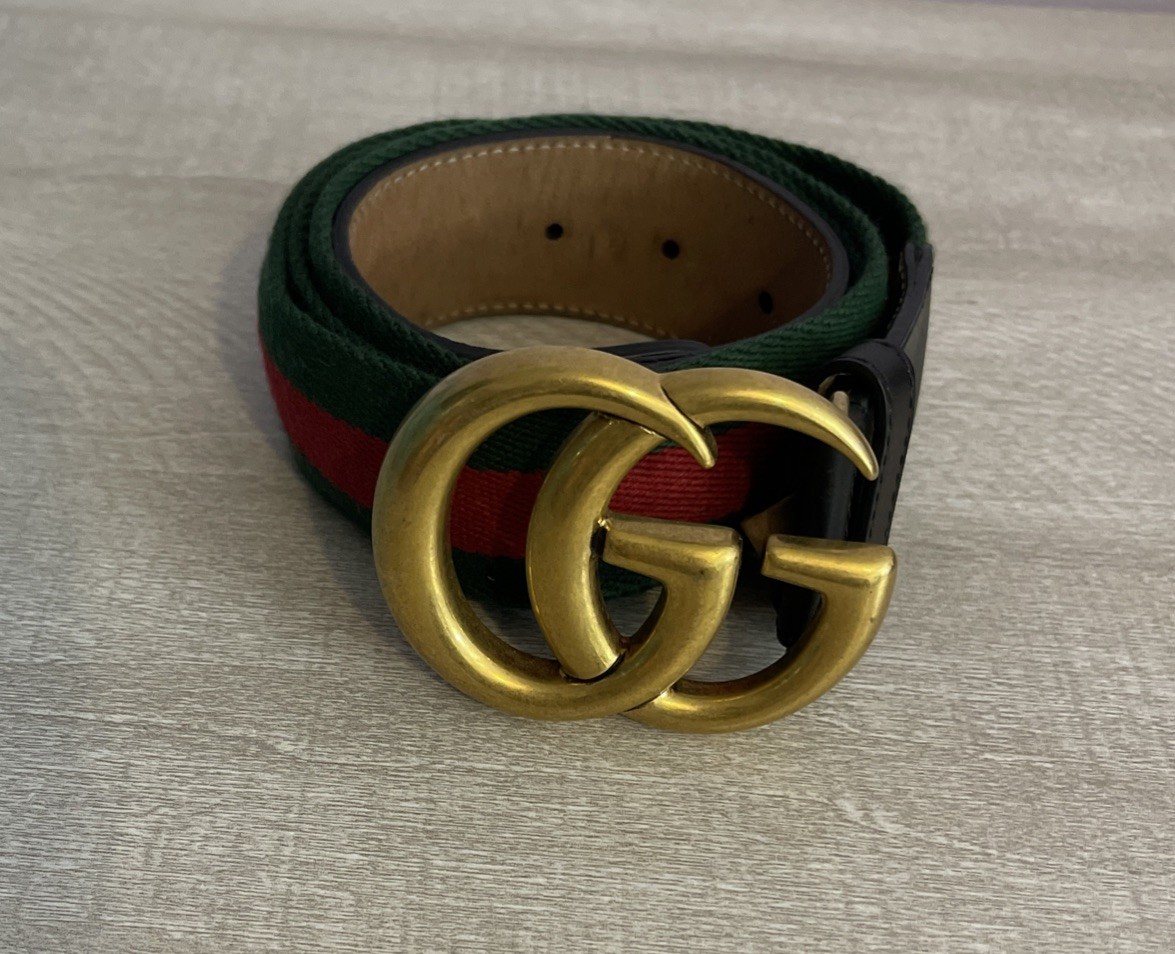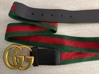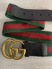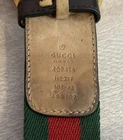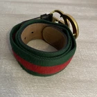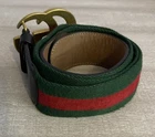 This Gucci Green & Red Striped Double G Web Belt is a stylish accessory designed for unisex adults. Featuring a classic striped pattern in green and red, this belt is made of leather, brass, and cotton canvas materials, with adjustable sizing for a comfortable fit. The belt comes with a buckle and logo accents, adding a touch of designer flair to any outfit. Perfect for adding a pop of color and sophistication to your wardrobe, this Gucci belt is a versatile addition to your collection. No bag or dust cover available.