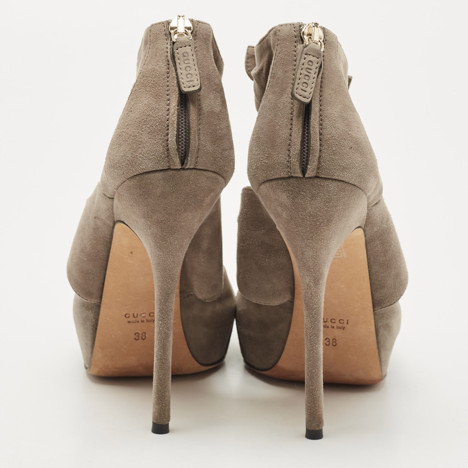 These sandals will frame your feet in an elegant manner. Crafted from quality materials, they flaunt a classy display, comfortable insoles and durable heels.Certified by The Luxury Closet - This item has gone through a detailed authentication process overseen by our experts. We offer a lifetime guarantee of authenticity on all our items. Import duties, taxes and charges are not included in the item price. These charges are the buyers responsibility. Please check with your country’s customs office to determine what these additional cost will be prior to buying. Our eBay Store About Us Contact Us Add to Favorite Sellers Gucci Grey Suede Bow Ankle Strap Sandals Size 38 $150.7 These sandals will frame your feet in an elegant manner. Crafted from quality materials, they flaunt a classy display, comfortable insoles and durable heels. Product Details Brand Color Grey Dimensions Material Suede Size 38 Outsole Width 7 cm Outsole Length 19 cm Heel Height 12 cm Includes The Luxury Closet Packaging Certified by The Luxury Closet This item has gone through a detailed authentication process overseen by our experts. We offer a lifetime guarantee of authenticity on all our items. How We Check The in-house team of experts at The Luxury Closet is highly trained to verify the authenticity and the condition of the luxury products. They ensure that only 100% authentic items are put on sale.The evaluation process is unique with its own mix of assessment criteria and differs according to the category. Each item is evaluated based on the following combination of hallmarks, hardware, stitching, symmetry, material, craftsmanship, stamping, codes, hologram stickers, and packaging. Our authenticators also check if the items have been modified or amended (e.g., aftermarket diamonds, replaced batteries, repaired bags, etc.) International Buyers Import duties, taxes and charges are not included in the item price. These charges are the buyers responsibility. Please check with your country’s customs office to determine what these additional cost will be prior to buying.