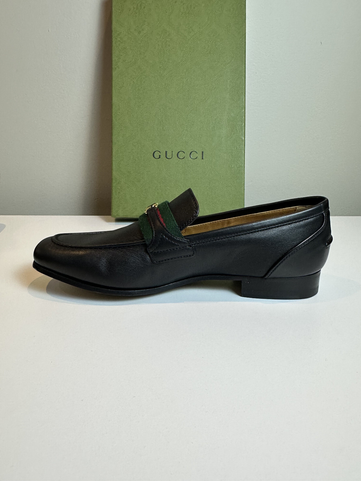 New Authentic Gucci Loafers From Gucci HA HA HA collection. Colaboration between Gucci’s former Creative Director, Alessandro Michele and Harry Styles. The loafer features the Interlocking G and Web stripe. Black leather Gold-toned hardware Interlocking G Green and red Web Leather sole 1" heel height with .2" platform, based on a size 8 (IT) Made in Italy New in Box, with dustbag Size US7.5, EU 40.5, and UK 6.5