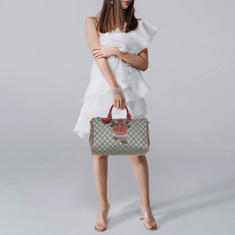 Our eBay Store About Us Contact Us Add to Favorite Sellers Gucci Heart Tattoo RedBlue GG Supreme Canvas and Leather Boston Bag This Boston bag mixes Gucci’s blue GG Supreme canvas with bold heart tattoo graphics in red, giving it a vintage feel. The shape keeps everything organized, while the leather trim and top handles make it sturdy for daily use or short trips. Product Details Brand Gucci Includes Original Dustbag, Info Booklet, Strap Certified by The Luxury Closet This item has gone through a detailed authentication process overseen by our experts. We offer a lifetime guarantee of authenticity on all our items. How We Check The in-house team of experts at The Luxury Closet is highly trained to verify the authenticity and the condition of the luxury products. They ensure that only 100% authentic items are put on sale.The evaluation process is unique with its own mix of assessment criteria and differs according to the category. Each item is evaluated based on the following combination of hallmarks, hardware, stitching, symmetry, material, craftsmanship, stamping, codes, hologram stickers, and packaging. Our authenticators also check if the items have been modified or amended (e.g., aftermarket diamonds, replaced batteries, repaired bags, etc.) Please note that this handbag may have a perfume scent, as it was stored and packaged in Dubai where such fragrances are commonly used. International Buyers Import duties, taxes and charges are not included in the item price. These charges are the buyers responsibility. Please check with your country’s customs office to determine what these additional cost will be prior to buying.