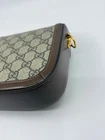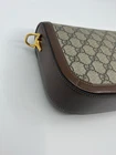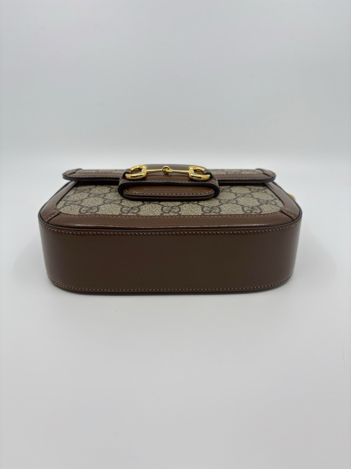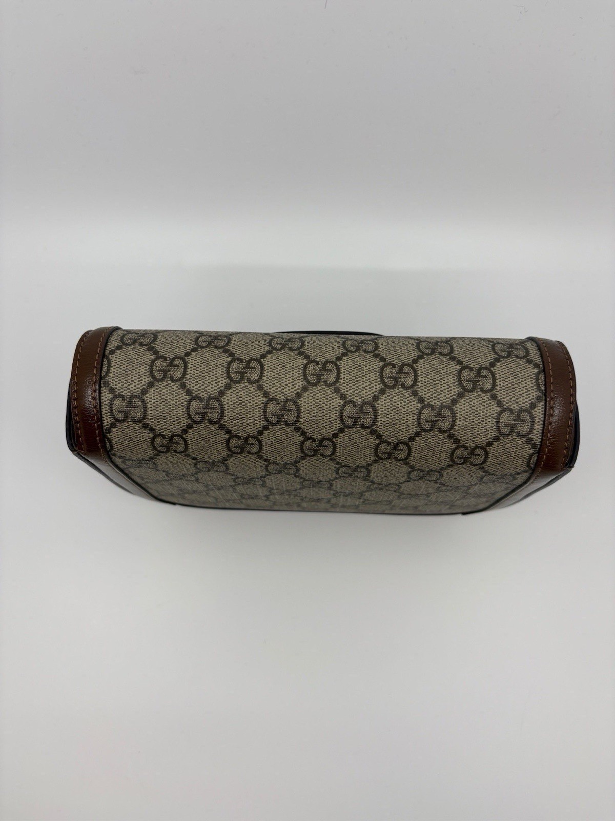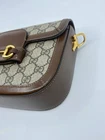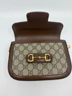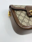 The Gucci Horsebit 1955 GG Coated Shoulder Bag in Mini Brown Canvas is a luxurious and stylish handbag designed for women. Made with coated exterior canvas and featuring the iconic Gucci GG pattern, this rectangular shaped bag exudes elegance and sophistication. The brown leather handle/strap adds a touch of luxury, while the gold hardware adds a touch of glamour. With a magnetic closure and a lined interior, this bag is both practical and chic. Perfect for any fashion-forward woman looking to make a statement with their accessories. Made in Italy by the renowned brand Gucci, this shoulder bag is a must-have for any wardrobe.