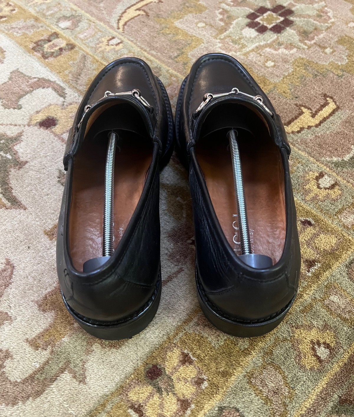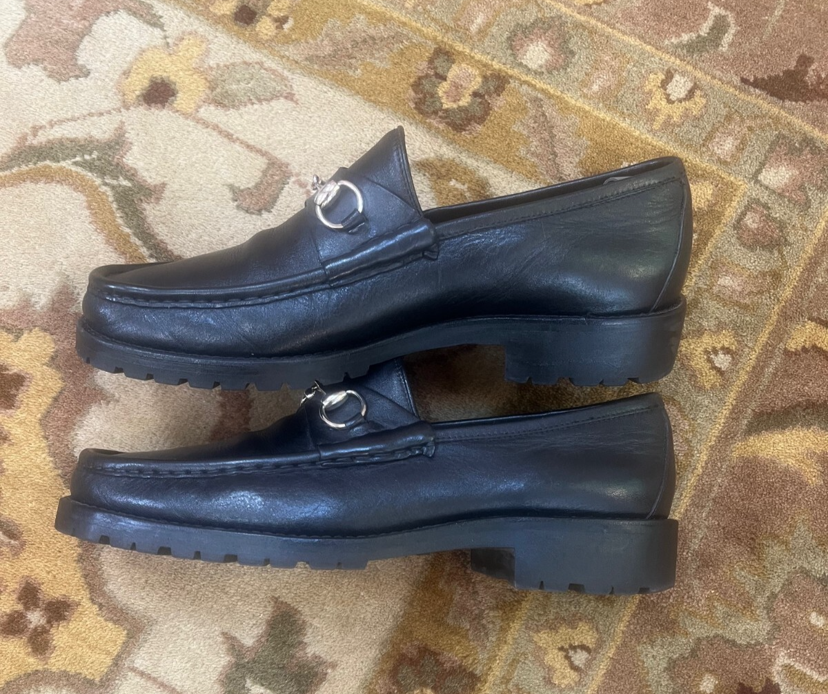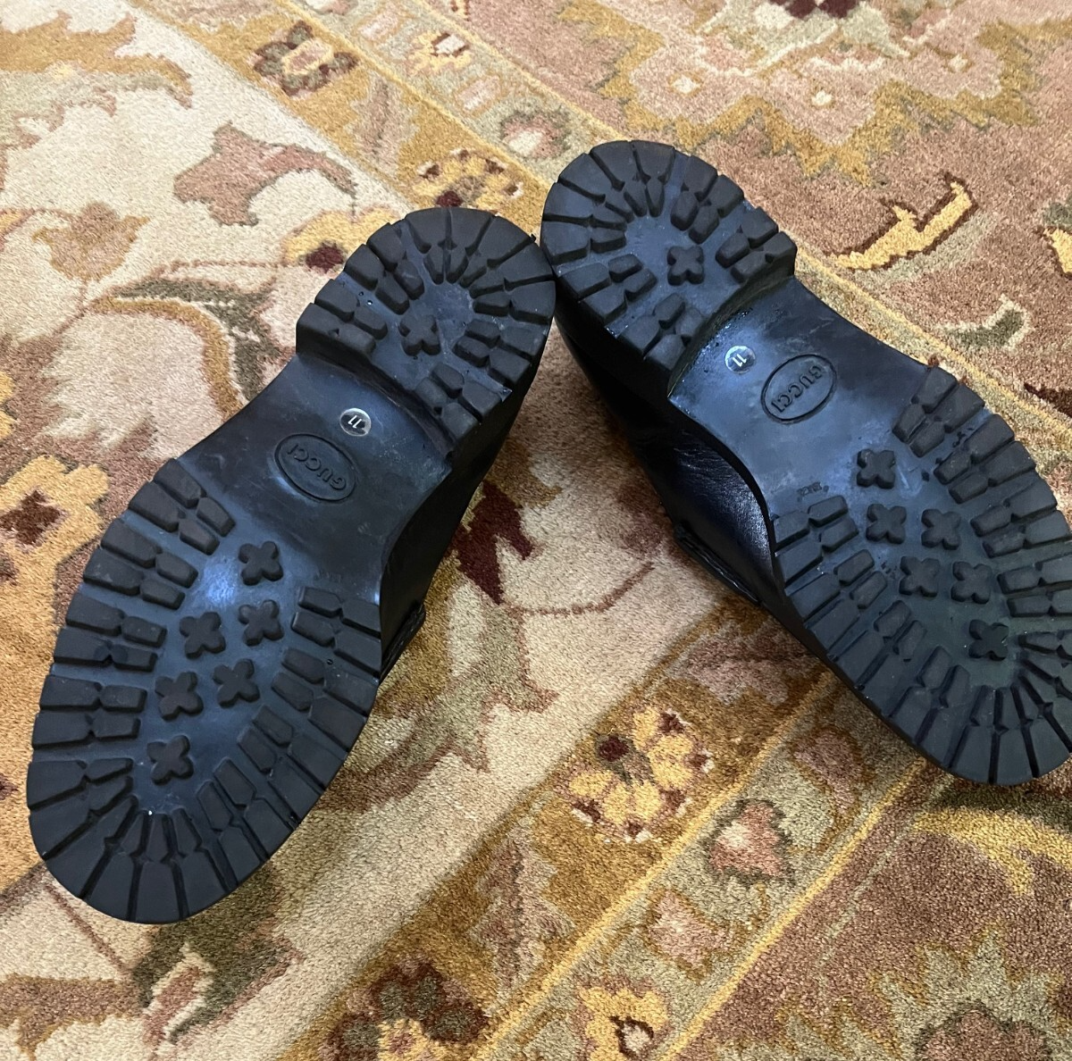 Beautiful Gucci Men's Horsebit Chunky leather shoes. Black in size 11 US. Made in Italy. Signature Gucci style. These are high end iconic Gucci shoes that retail for $1,195 or more. Handcrafted Italian designed footwear. Impeccably maintained with moderate wear. Shipped via US Priority Mail w/insurance included. Long time Ebay seller with perfect feedback. Shoe trees not included.