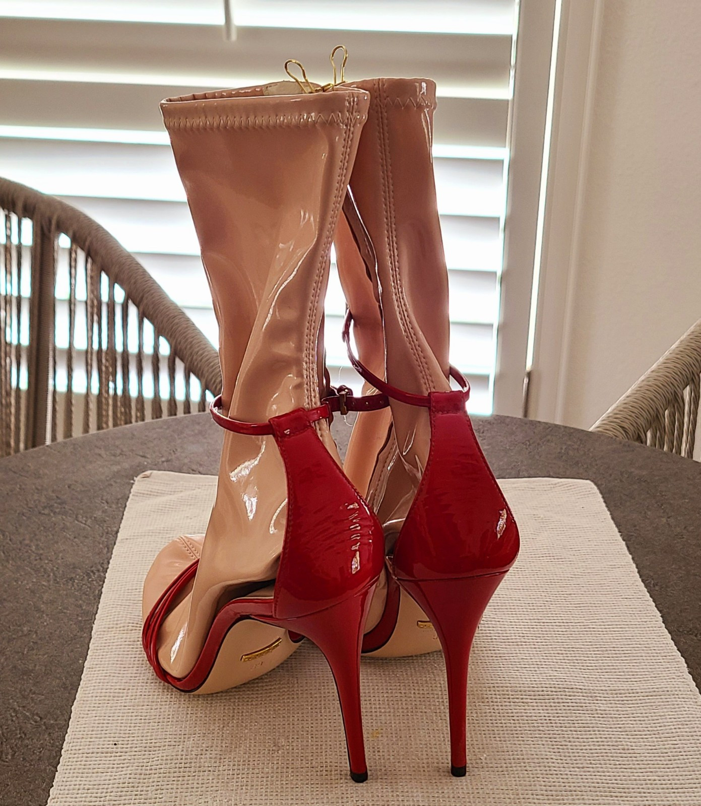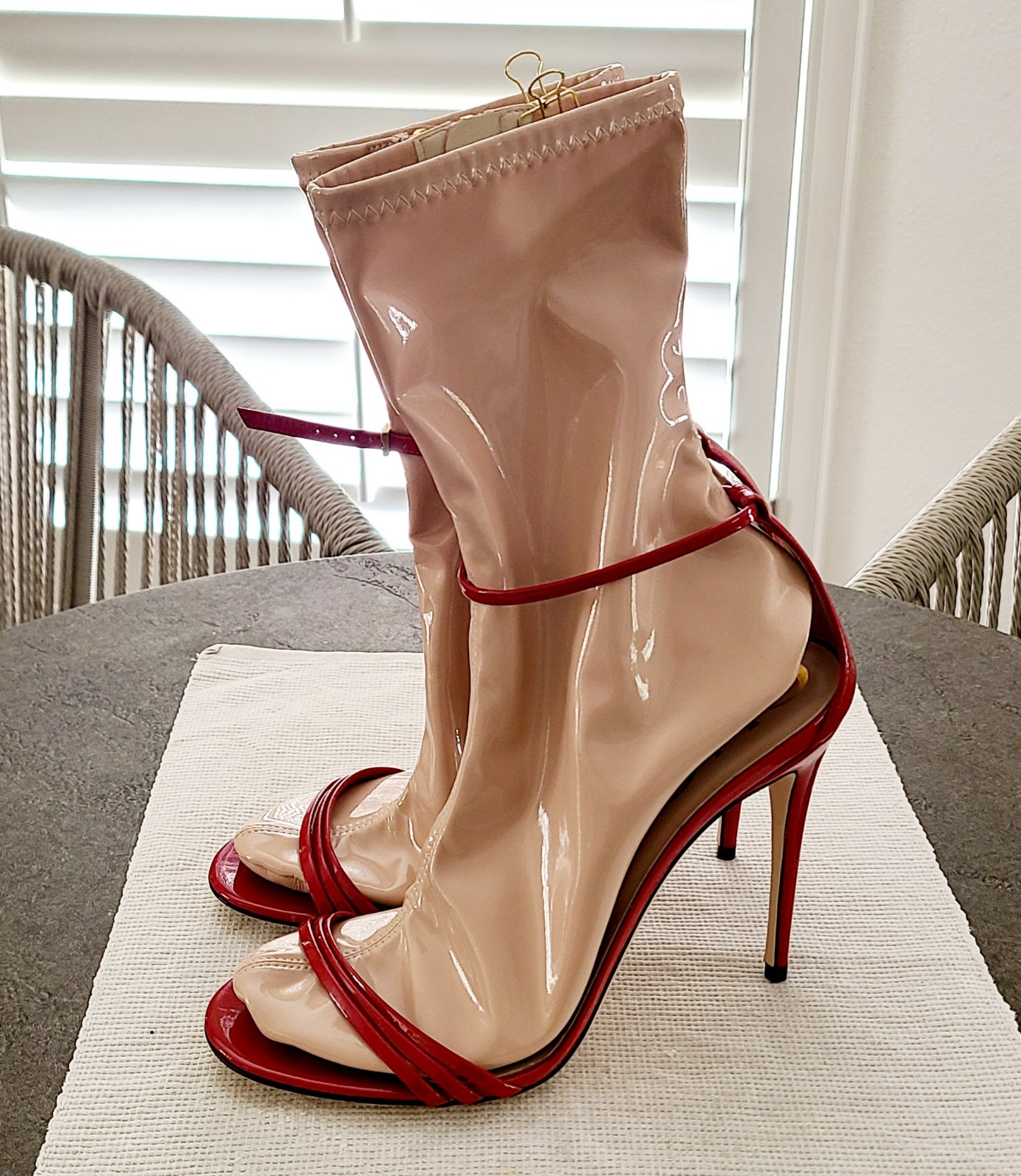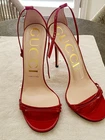 These Gucci sandals are absolutely stunning! The bold red patent leather and strappy design make them a head-turner, while the latex socks add a fun, edgy touch. The stiletto heel gives just the right lift, and the ankle strap keeps them secure. Perfect for making a statement—love the luxurious feel and flawless new condition!