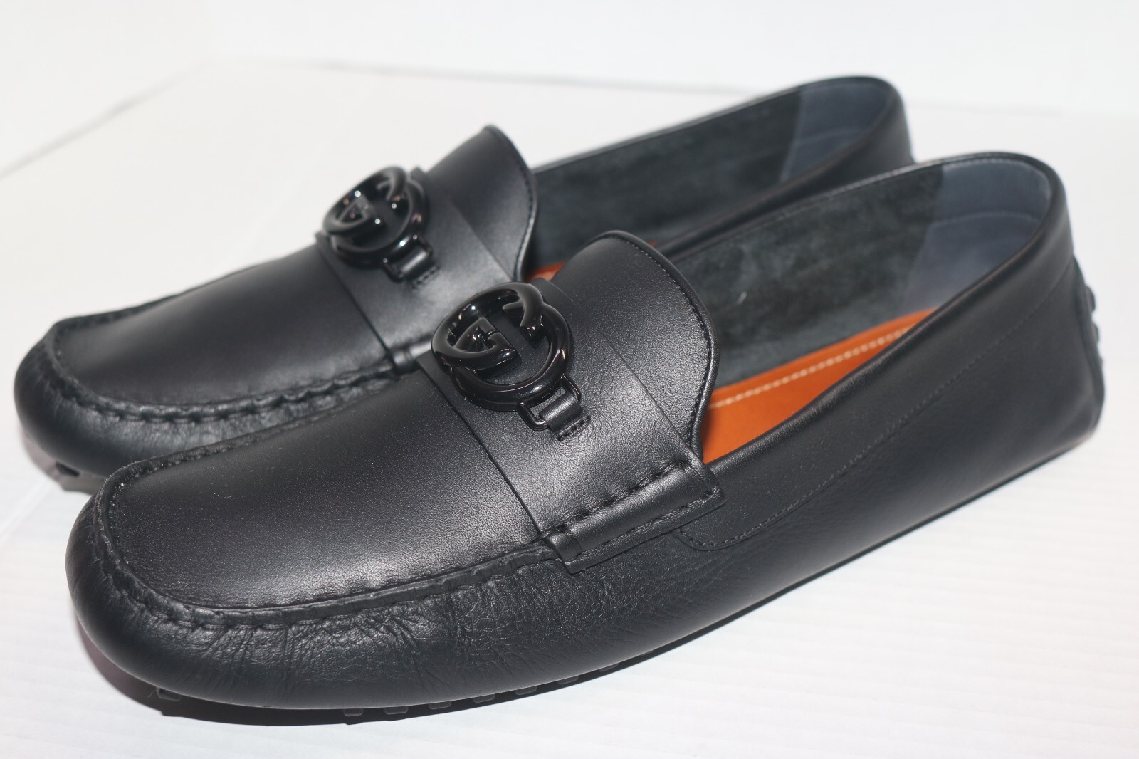 Gucci 692379 Interlocking G Driver Loafers Black Size 11.5 Black calfskin leather Interlocking G Buckle Rubber driver soles Tan leather insole Made in Italy Size 11.5 = 12 US MENS