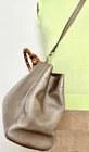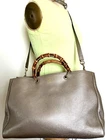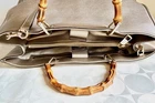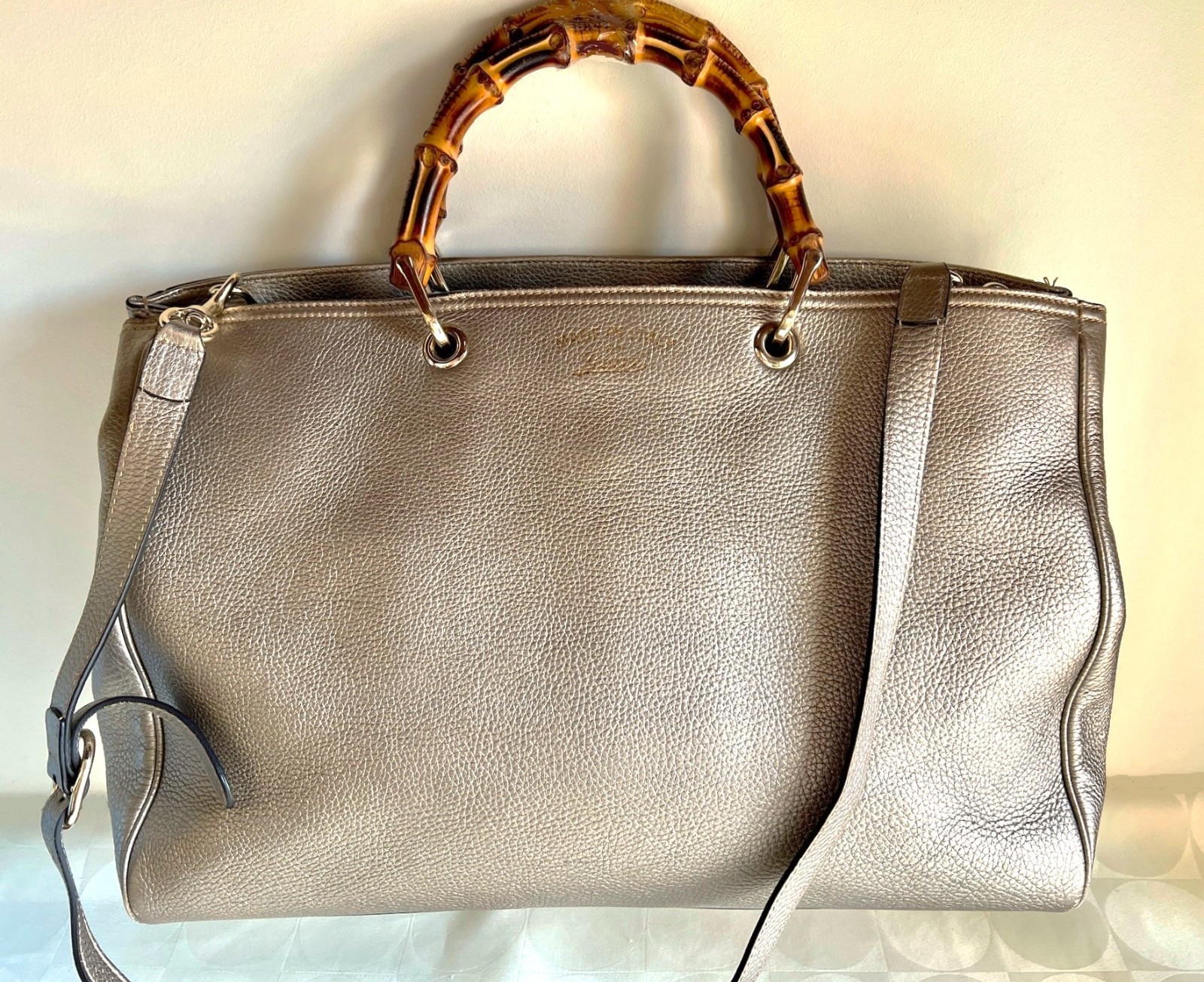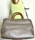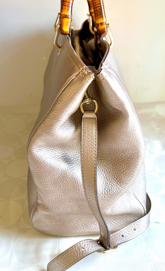 The Bamboo Shopper features a leather body, bamboo top handles, a detachable leather shoulder strap, an open top with magnetic snap closure, and interior zip and slip pockets. Closure: dual compartment magnet snap • Pockets: 2 interior patch, 2 interior zip, 1 snap • Features: beige canvas lining, d rings, gold Gucci stamp, double bamboo handle • Material: calfskin leather • Hardware: golden • Made in: Italy Corners: faint wear Measurements: 12 "H x 12"W x 6 "D 5" handle drop, Single Strap Drop 20" pre-owned condition It Would Definitely Make a Perfect Addition to Your Wardrobe.