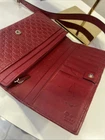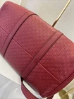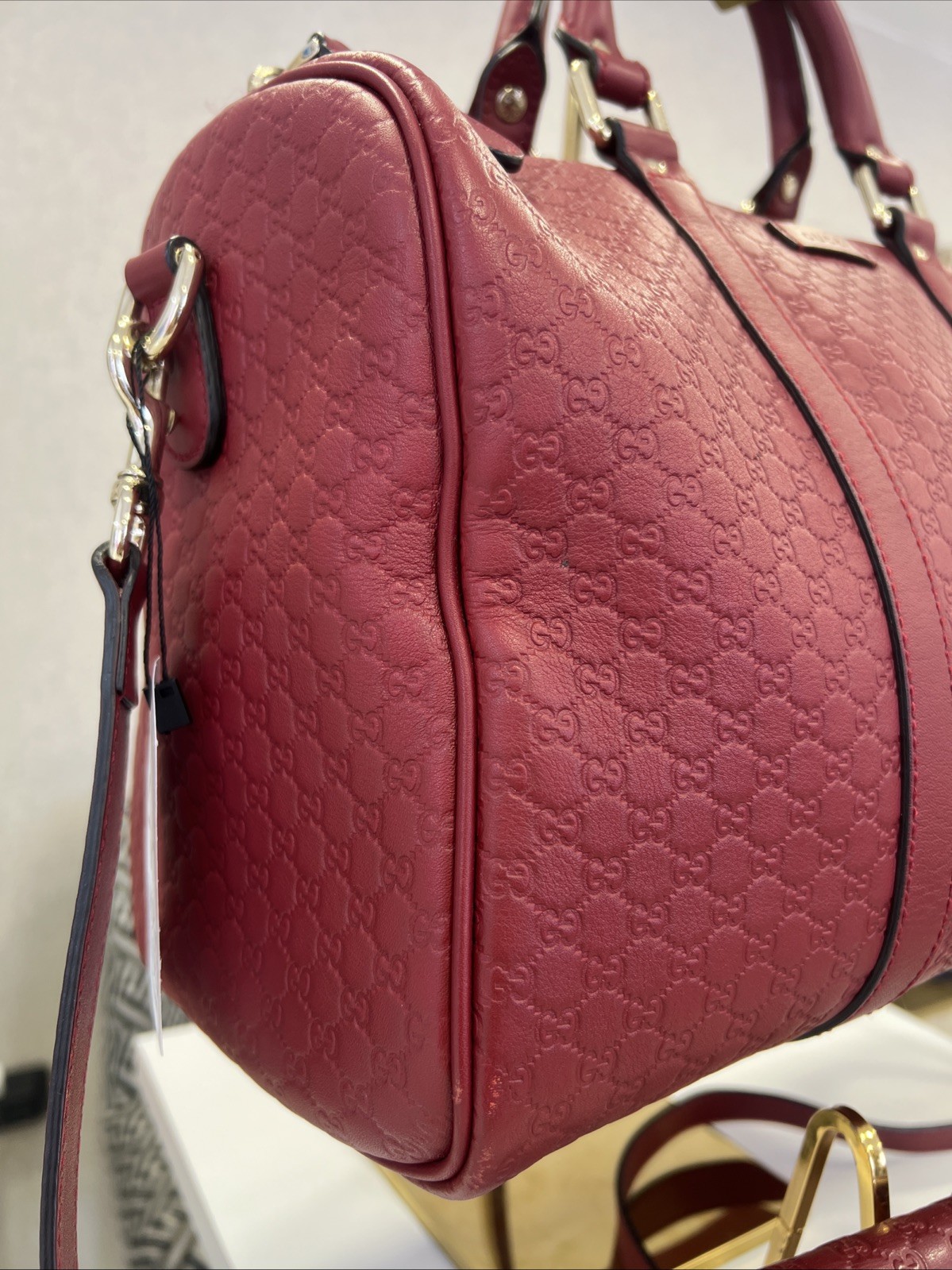 The Gucci Leather Handbag is a luxurious Boston Bag made from Guccissima leather in a medium size. This rectangular-shaped tote features a zip closure, gold hardware, and a coated exterior in a bold red color. It also includes inner pockets for organization and a leather handle drop of 4.5 inches for easy carrying. Crafted in Italy by the prestigious brand Gucci, this handbag exudes high-end designer style for fashion-forward women looking to make a statement.