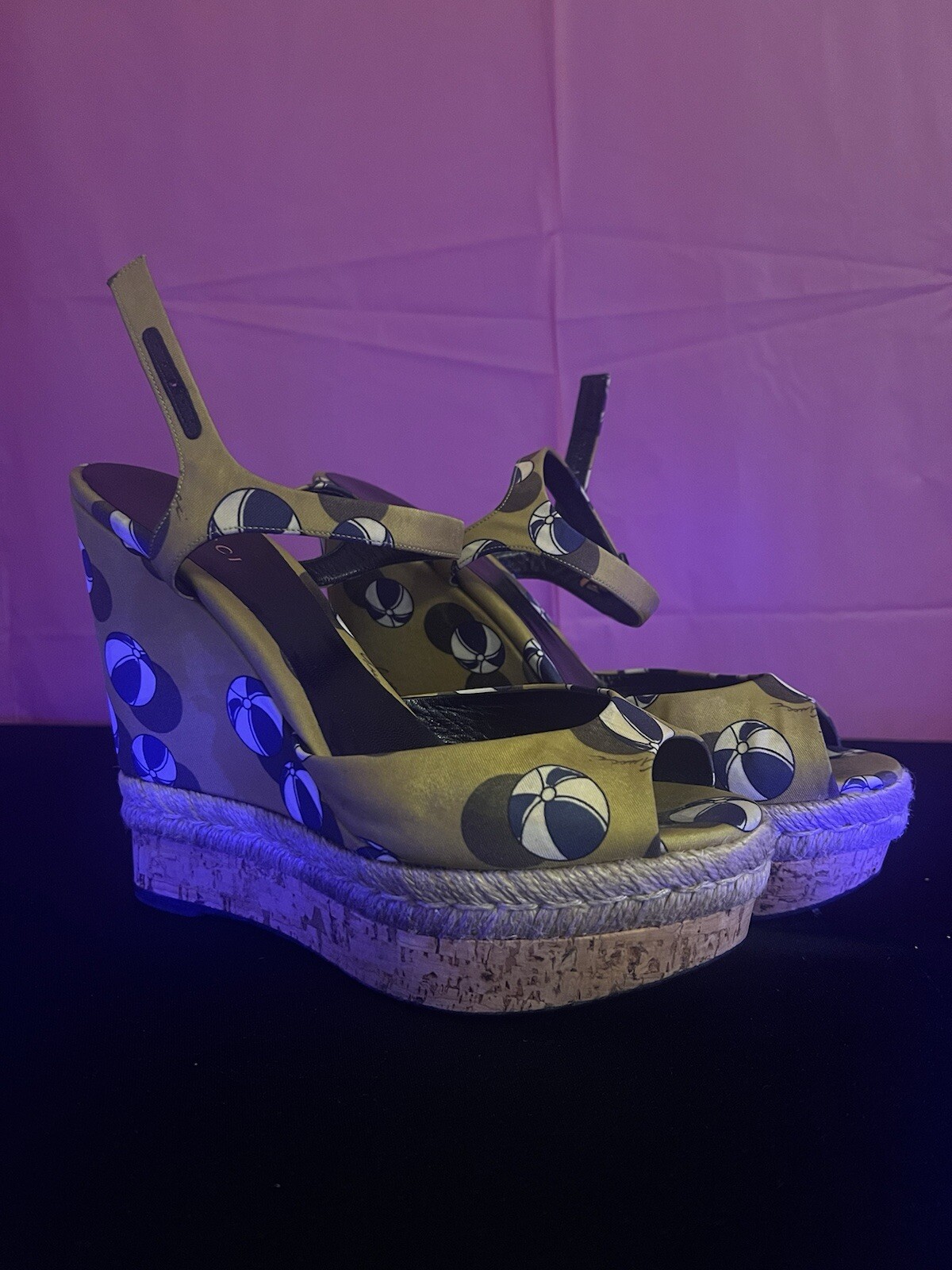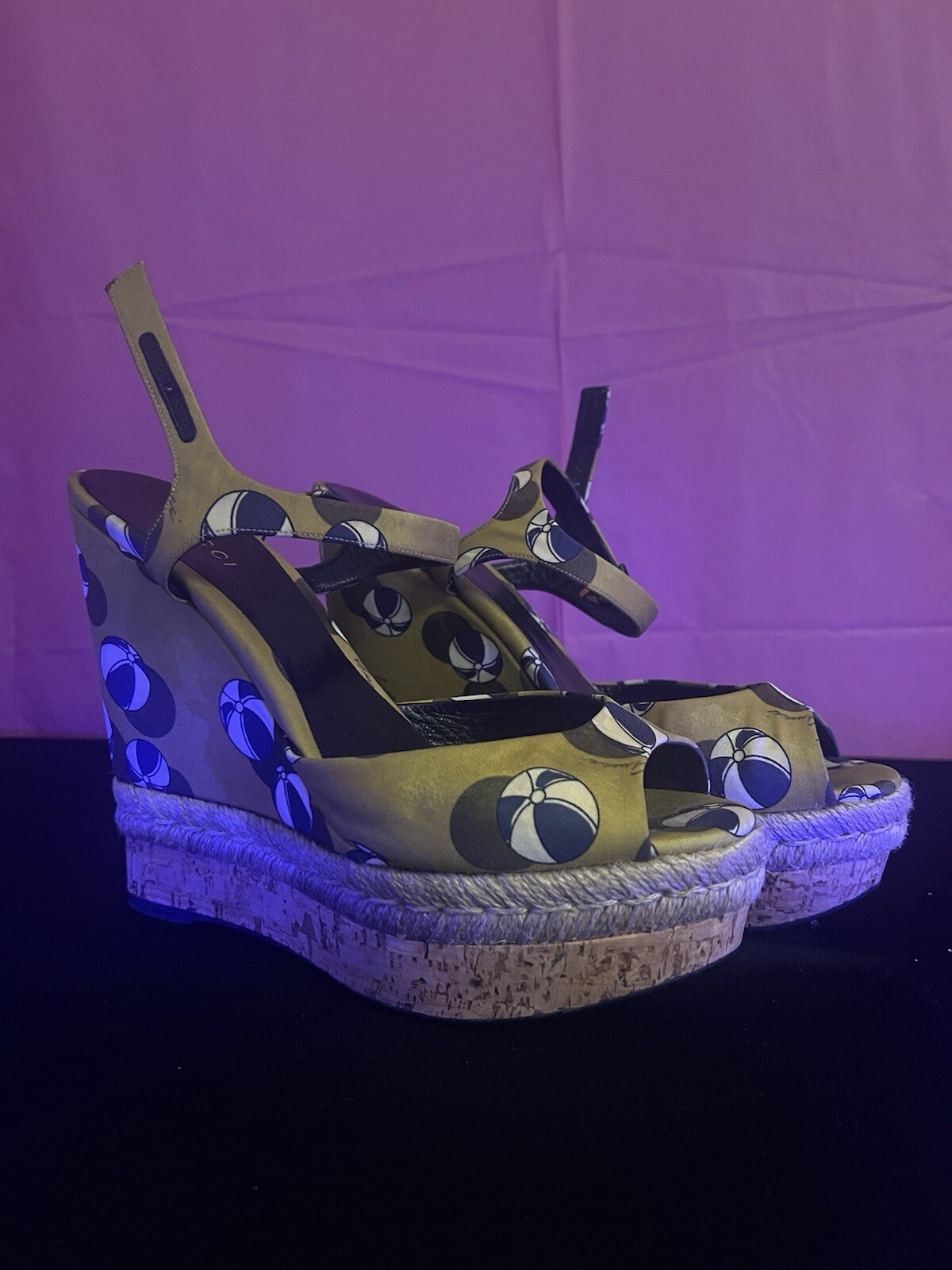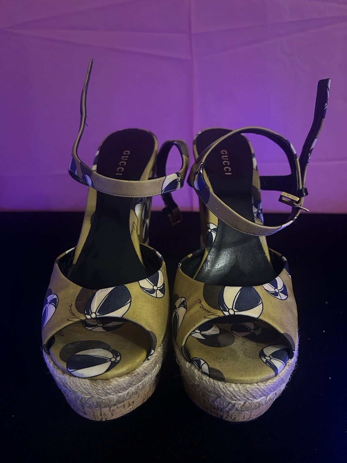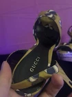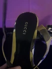 The shoes are pre-owned and have wearing on the rubber outer soles. The inner soles are in good condition, and the Gucci logo can be seen in full view.