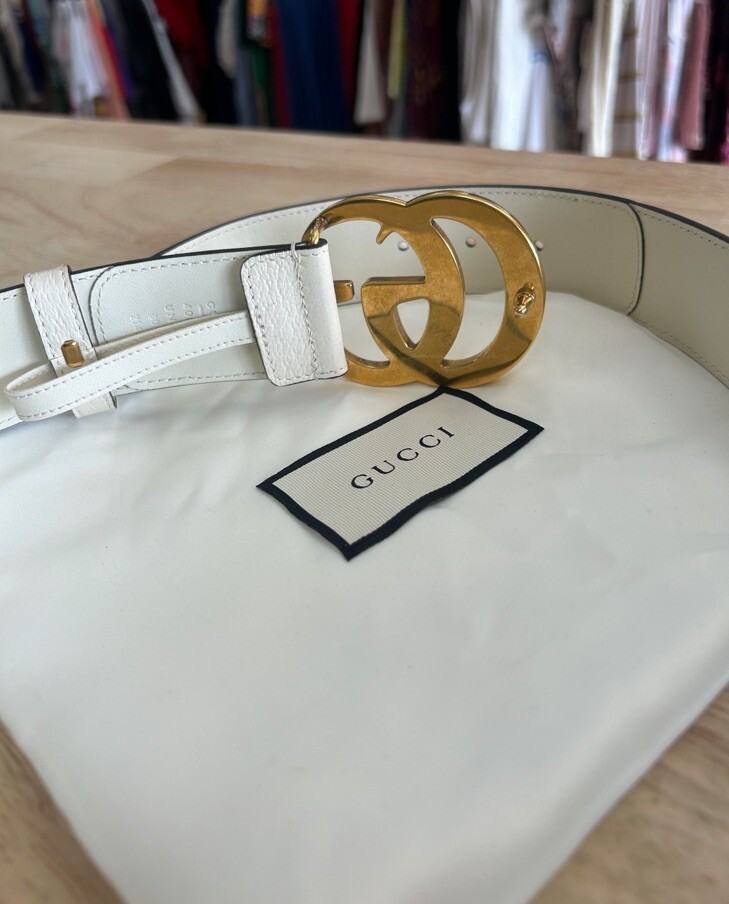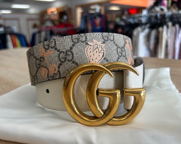 Amazing belt by Gucci White leather with gold hardware and signature Canvas with limited edition fruit pattern on canvas- so cute! The fruits are all a light pink color. Size 80 which measures to a 26" in us 35" total length No scratches on metal Includes dustbag