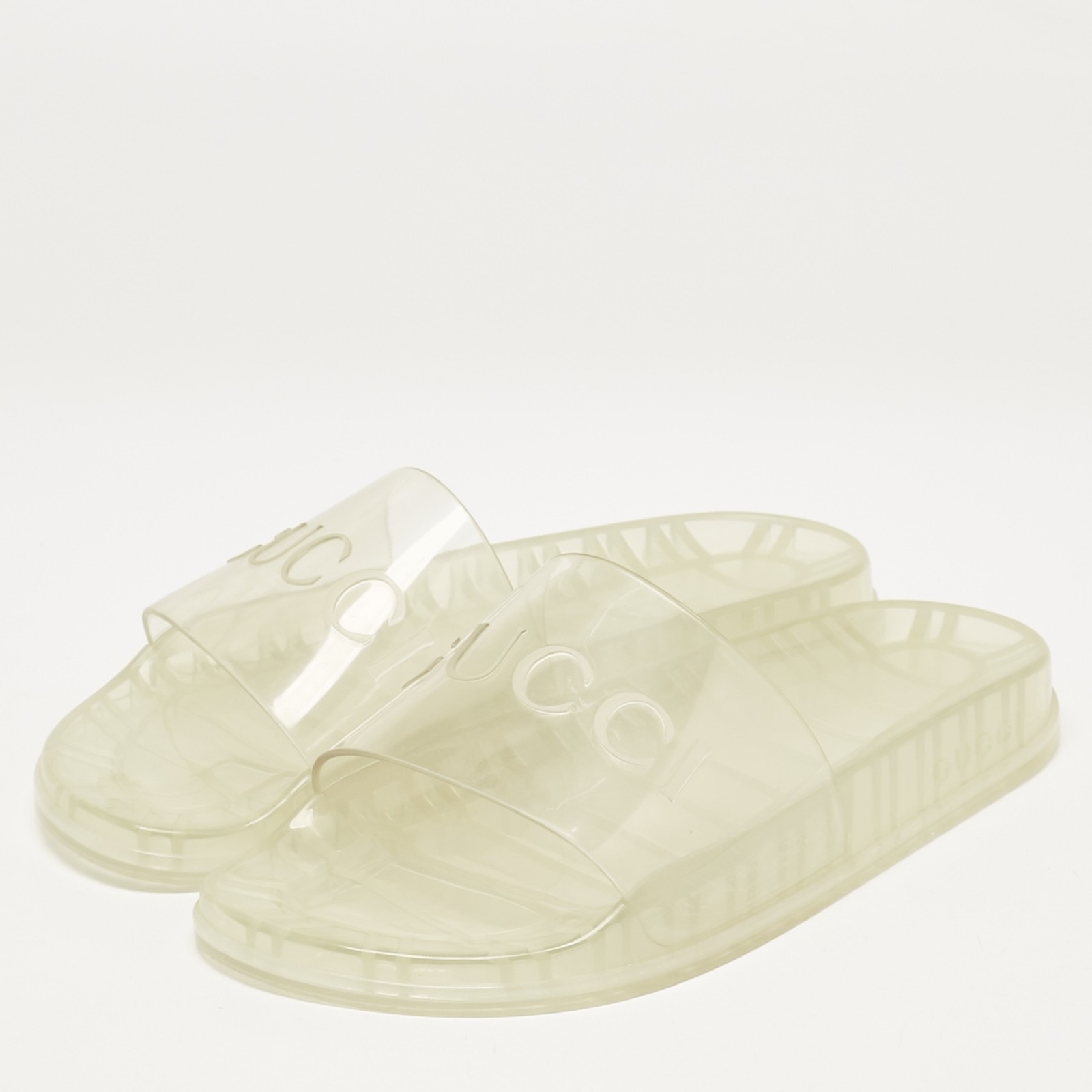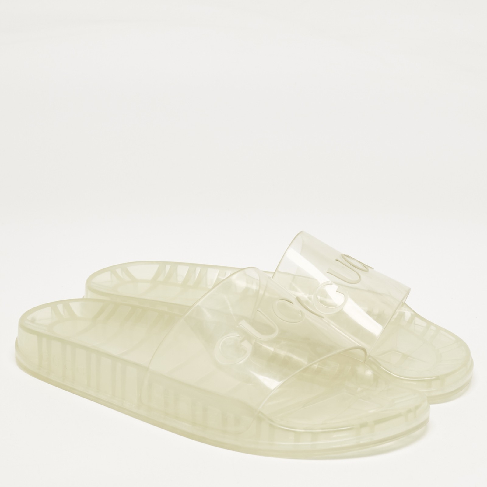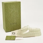 Made in Italy, these fun Gucci slides are a playful take on a staple style. Crafted from rubber, the slides feature branding on uppers for a luxe slant. The transparent pair projects fun appeal with water resistant wearability.Certified by The Luxury Closet - This item has gone through a detailed authentication process overseen by our experts. We offer a lifetime guarantee of authenticity on all our items. Import duties, taxes and charges are not included in the item price. These charges are the buyers responsibility. Please check with your country’s customs office to determine what these additional cost will be prior to buying. Our eBay Store About Us Contact Us Add to Favorite Sellers Gucci Transparent Rubber Logo Slide Sandals Size 44 $248.6 Made in Italy, these fun Gucci slides are a playful take on a staple style. Crafted from rubber, the slides feature branding on uppers for a luxe slant. The transparent pair projects fun appeal with water resistant wearability. Product Details Brand Color Transparent Dimensions Material Rubber Size 44 Outsole Width 11.5 cm Outsole Length 29 cm Heel Height Includes Original Dustbag, Info Booklet, Original Box Certified by The Luxury Closet This item has gone through a detailed authentication process overseen by our experts. We offer a lifetime guarantee of authenticity on all our items. How We Check The in-house team of experts at The Luxury Closet is highly trained to verify the authenticity and the condition of the luxury products. They ensure that only 100% authentic items are put on sale.The evaluation process is unique with its own mix of assessment criteria and differs according to the category. Each item is evaluated based on the following combination of hallmarks, hardware, stitching, symmetry, material, craftsmanship, stamping, codes, hologram stickers, and packaging. Our authenticators also check if the items have been modified or amended (e.g., aftermarket diamonds, replaced batteries, repaired bags, etc.) International Buyers Import duties, taxes and charges are not included in the item price. These charges are the buyers responsibility. Please check with your country’s customs office to determine what these additional cost will be prior to buying.