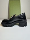Brand new in box Gucci women’s chunky loafers crafted in black leather. Gold horsebit. Bold lug sole. 100% Authentic. Includes original Gucci box and protective dust bags. Details: Brand: Gucci Style: Chunky Horsebit Loafers Color: Black Material: Calfskin leather upper, rubber sole Size: EU39 US9 Condition: New in box Includes: Gucci box and two dust bags Made in Italy