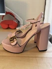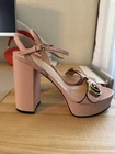 Elevate your fashion game with these stunning Gucci Marmont Platform Heel Sandals. Crafted from high-quality leather and featuring an eye-catching pink color, these sandals are the perfect addition to any stylish woman's shoe collection. The hook and loop closure ensures a comfortable and secure fit, while the wedge heel style provides a comfortable and stylish lift. These sandals are a size 7.5 US and 37.5 EU, making them a great fit for most women. They are part of the popular Gucci Marmont product line and are perfect for any occasion, from a casual day out to a formal event. Add these gorgeous platform heels to your collection today and step out in style. In like-new condition. Does not come with box.