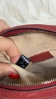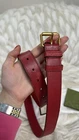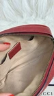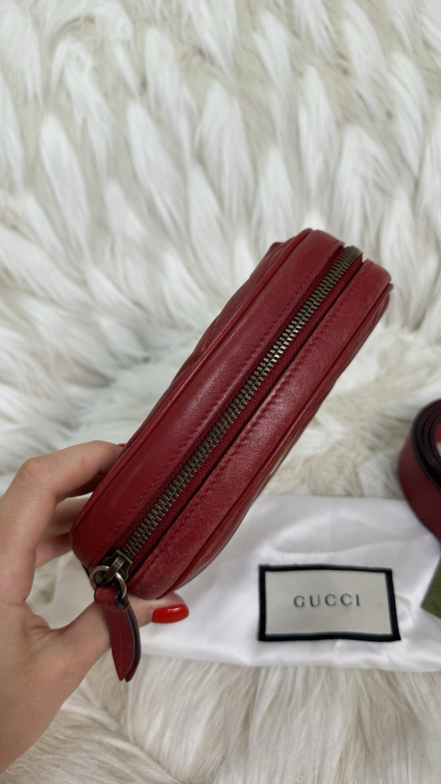 This Gucci Marmont belt bag is a stylish and functional accessory for any woman. Bag is in very good condition. With a beautiful chevron pattern on a red leather exterior, this bag is sure to make a statement. It features a zip closure and a small size, measuring 7 inches in width, 4.33 inches in height, and 2 inches in depth. The bag has a beige suede lining and gold hardware, complementing the red leather and adding a touch of luxury. The bag also comes with an original dust bag for safekeeping. Perfect for everyday use or special occasions, this Gucci Marmont belt bag is a must-have for any fashion-forward woman.
