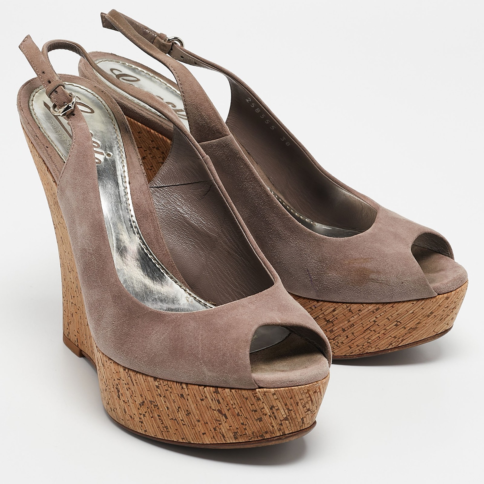 Effortlessly chic, these Gucci mauve sandals feature a cork wedge that adds height and comfort. Their soft suede straps exude understated elegance, making them a versatile addition to your summer wardrobe. Perfect for casual outings or elevating a breezy sundress.Certified by The Luxury Closet - This item has gone through a detailed authentication process overseen by our experts. We offer a lifetime guarantee of authenticity on all our items. Import duties, taxes and charges are not included in the item price. These charges are the buyers responsibility. Please check with your country’s customs office to determine what these additional cost will be prior to buying. Our eBay Store About Us Contact Us Add to Favorite Sellers Gucci Mauve Suede Cork Wedge Sandals Size 38 $163.9 Effortlessly chic, these Gucci mauve sandals feature a cork wedge that adds height and comfort. Their soft suede straps exude understated elegance, making them a versatile addition to your summer wardrobe. Perfect for casual outings or elevating a breezy sundress. Product Details Brand Color Purple Dimensions Material Suede Size 38 Outsole Width 8 cm Outsole Length 22.5 cm Heel Height 14 cm Includes Original Box Certified by The Luxury Closet This item has gone through a detailed authentication process overseen by our experts. We offer a lifetime guarantee of authenticity on all our items. How We Check The in-house team of experts at The Luxury Closet is highly trained to verify the authenticity and the condition of the luxury products. They ensure that only 100% authentic items are put on sale.The evaluation process is unique with its own mix of assessment criteria and differs according to the category. Each item is evaluated based on the following combination of hallmarks, hardware, stitching, symmetry, material, craftsmanship, stamping, codes, hologram stickers, and packaging. Our authenticators also check if the items have been modified or amended (e.g., aftermarket diamonds, replaced batteries, repaired bags, etc.) International Buyers Import duties, taxes and charges are not included in the item price. These charges are the buyers responsibility. Please check with your country’s customs office to determine what these additional cost will be prior to buying.