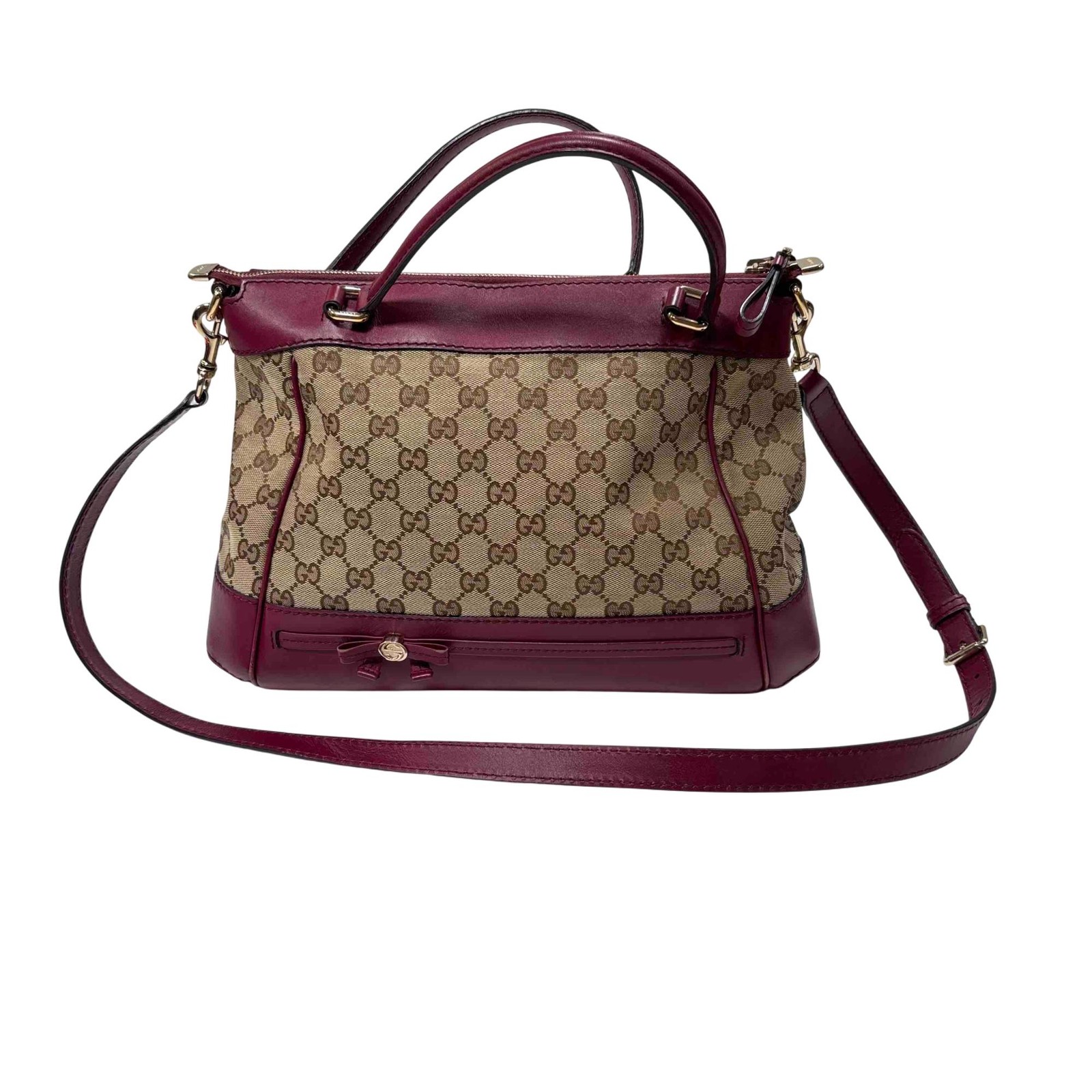 PAWN AMERICA KEY TECHNICAL SPECIFICATIONS : Brand: Gucci Exterior Material: Canvas - Leather Style: Tote Exterior Color: Beige And Burgundy/purple Department: Women Product Line: Mayfair Size: Medium Handle/Strap Material: Leather Handle/Strap Color: Burgundy Hardware Color: Gold Pattern: Monogram Closure: Zipper Accessories: Gucci dust bag Model: Mayfair Country/Region of Manufacture: Italy Hardware Material: Metal Shape: Rectangle Handle Style: Double Handles Fabric Type: Gg Canvas Features : 13 1/8"-Length 8"-Height 6"-Width Elevate your style with this authentic Gucci Mayfair Tote, expertly crafted from the iconic GG canvas with rich burgundy/purple leather trim. Featuring dual handles, a detachable shoulder strap, and signature bow detail, this luxurious shoulder bag is both elegant and versatile, perfect for everyday use or special occasions. Own a piece of timeless Italian craftsmanship that blends sophistication with practical functionality. What's Included : Gucci Mayfair GG Canvas and Leather Tote Bag Burgundy/Purple Accents Gucci dust bag Condition : Previously owned. The bag is in good condition with just some light creases and wear on the bottom. See photos for details. Reference: 40199000442 Note: Overnight Shipping order cut off time is 1PM CST. HOME | LOCATIONS | SERVICES | PRODUCTS | CAREERS | CONTACT US