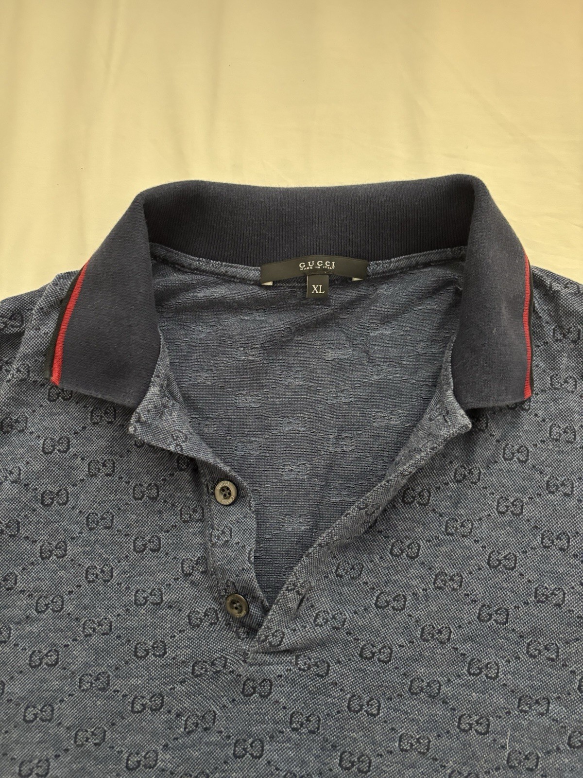 The Gucci Men's Collared Polo Shirt in blue, size XL, is a designer piece crafted from cotton. This short sleeve shirt features a button closure and is machine washable, making it a convenient and stylish addition to any casual wardrobe. Made in Italy, this polo exudes a designer theme perfect for summer and spring seasons.