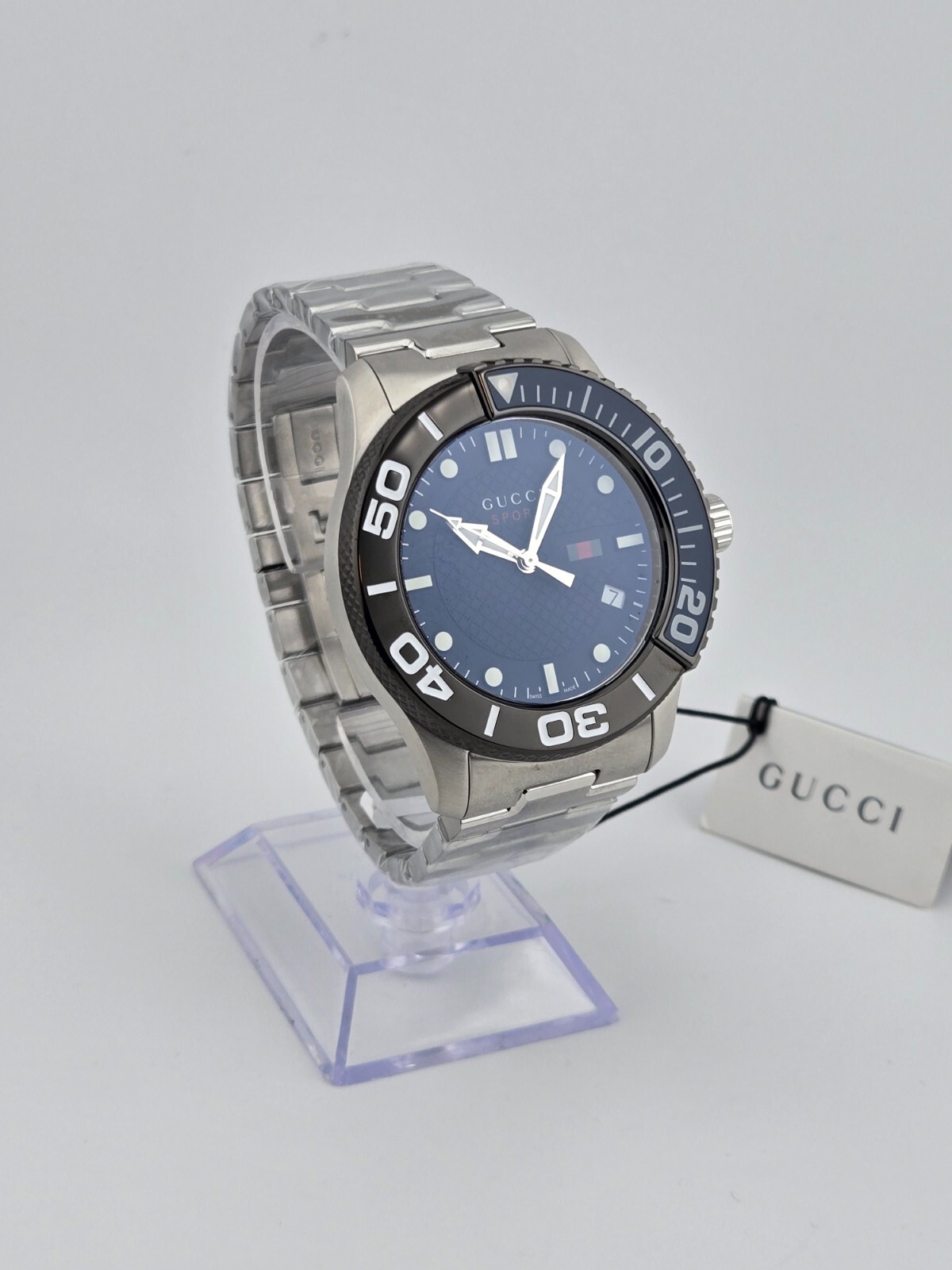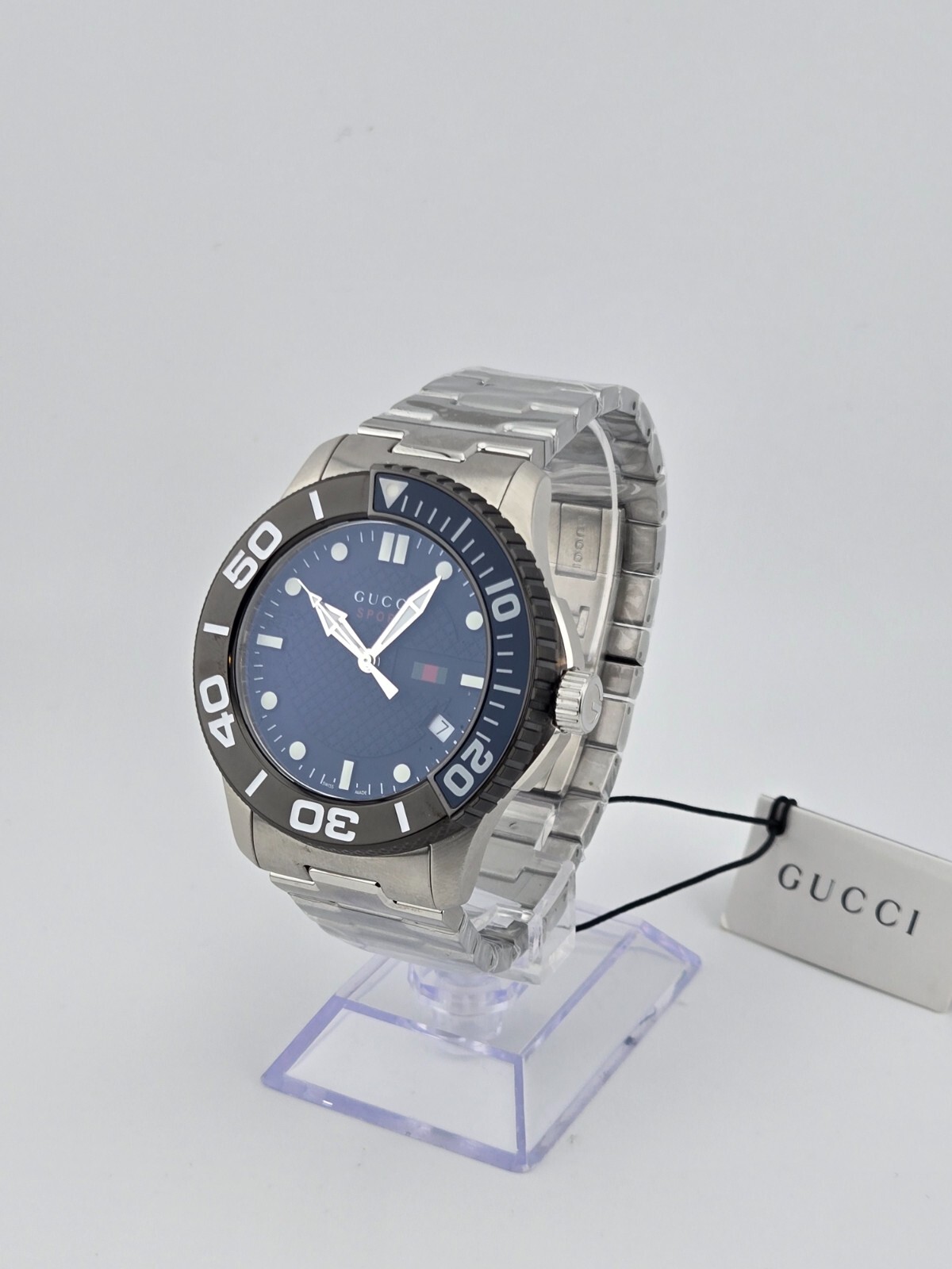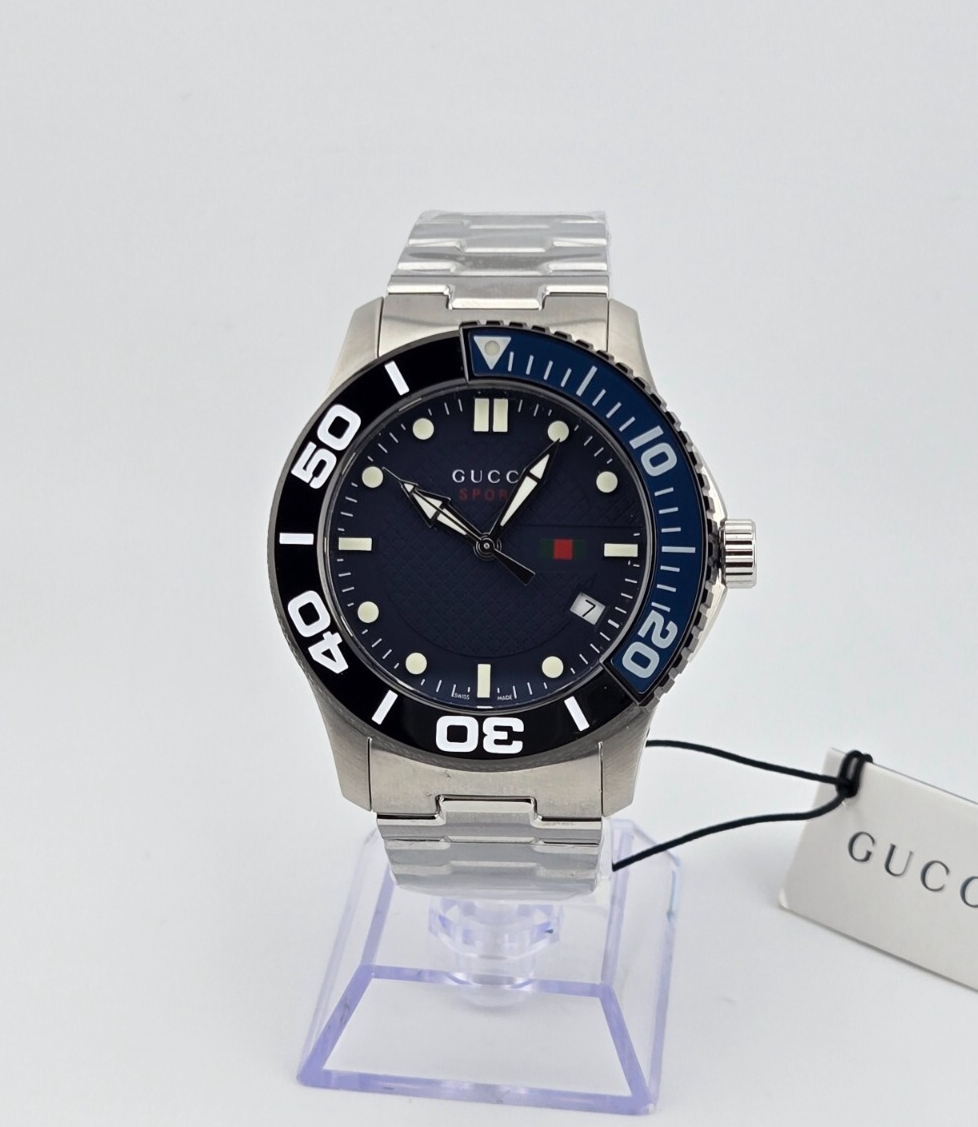 Gucci Men’s 126 G-Timeless Blue Dial Stainless Steel Watch YA126282 ($1180 MSRP) New with Original Box and Tags! This watch is a Shelf Pull from one of the Major Department Stores. May find few micro scratches on the watch case/band, visible under a direct and strong light. The Gucci Men’s 126 G-Timeless Blue Dial Stainless Steel Watch (Model YA126282) combines timeless luxury with contemporary design, making it a must-have accessory for any modern man. The brushed stainless steel case and bracelet give the watch a sophisticated and durable feel, while the striking blue dial provides a bold contrast, exuding a sense of refined elegance. The luminous hour and minute hands, along with the luminous hour markers, ensure excellent visibility even in low-light conditions, making this watch as functional as it is stylish. This timepiece features a date display at the 4:00 position for added practicality, and its bidirectional bezel, marked with minute markers, enhances the watch’s functionality. The Swiss quartz movement ensures accurate timekeeping, while the scratch-resistant sapphire crystal provides durability and clarity, keeping the dial pristine over time. The 45mm case diameter and 11mm case thickness offer a substantial yet comfortable fit, while the 23mm bracelet width ensures a strong, secure presence on the wrist. With a water resistance of up to 30 meters, this watch is suitable for everyday activities, though it's not designed for swimming or diving. The double locking fold-over clasp ensures a secure fit, providing peace of mind throughout the day. Whether worn for a business meeting or casual outing, the Gucci Men’s 126 G-Timeless Blue Dial Stainless Steel Watch combines classic design, practicality, and Swiss precision, making it an ideal addition to any collection. Features - Brushed Stainless Steel Case & Bracelet - Blue Dial - Luminous Hour & Minute Hands - Luminous Hour Markers - Date Display at 4:00 Position - Bidirectional Bezel - Minute Markers On Bezel - Sapphire Crystal - Water Resistant to 30 Meters - Swiss Quartz Movement - Double Locking Fold Over Clasp - Model Number: YA126282 - Case Diameter 45mm - Case Thickness 11mm - Bracelet Width 23mm Fast and Free Shipping You're already purchasing the item. Why pay additional for shipping, especially slow shipping? We get your order shipped out within 1-business day and delivered to your doorstep as quickly as possible. Competitive Pricing With our dynamic pricing model, our prices are always competitive. Our prices are some of the lowest that you will find on the internet. Rest assured that you're getting a good deal when purchasing with us. 30-day Money Back Guarantee We are committed to making sure that you leave this transaction satisfied. If you're unhappy with the product for any reason, you may return it back for your money-back or a replacement within 30 days. No questions asked!