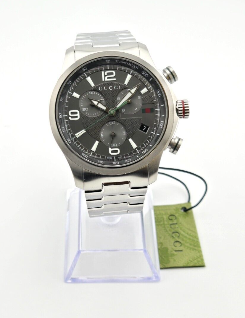 Gucci G-Timeless Men's Gray Dial Chronograph Watch - YA126238 ($1190 MSRP) With Original Box and Tags! This watch is a Shelf Pull from one of the Major Department Stores. Watch has micro scratches on the watch case/band, visible under direct light. The Gucci G-Timeless Men's Gray Dial Stainless Steel Watch - YA126238 is a sophisticated timepiece that embodies both functionality and style. This watch features a robust stainless steel case and bracelet, offering durability and a sleek, modern aesthetic. The fixed stainless steel bezel frames the gray dial, which is adorned with silver-tone hands and index hour markers for a clean, refined look. Arabic numerals at the 6, 9, and 12 o'clock positions add a touch of classic elegance. The dial also includes minute markers and a tachymeter scale around the outer rim, enhancing its functionality. Luminescent hands and markers ensure visibility in low-light conditions. The watch features a date display at the 4 o'clock position and a chronograph with three sub-dials that display 60 seconds, 30 minutes, and 1/10th of a second, providing precise time measurement capabilities. Powered by a reliable quartz movement, the Gucci G-Timeless guarantees accurate timekeeping. The scratch-resistant sapphire crystal protects the dial from damage, ensuring the watch remains in pristine condition. The solid case back and the robust construction further enhance its durability. With a case diameter of 44 mm and a thickness of 10 mm, this watch has a substantial presence on the wrist, while the 22 mm band width provides a balanced look. The fold-over clasp with a safety release ensures a secure and comfortable fit. Water-resistant up to 50 meters (165 feet), this watch is suitable for short periods of recreational swimming, but not for diving or snorkeling. The Gucci G-Timeless Men's Gray Dial Stainless Steel Watch - YA126238 is a versatile accessory that combines elegance with practicality. Its blend of classic and contemporary elements makes it suitable for both everyday wear and special occasions, ensuring you always make a stylish statement. Features Stainless steel case and bracelet. Fixed stainless steel bezel. Gray dial with silver-tone hands and index hour markers. Arabic numeral marks the 6, 9 and 12 o'clock position. Minute markers. Tachymeter around the outer rim. Dial Type: Analog. Luminescent hands and markers. Date display at the 4 o'clock position. Chronograph - three sub-dials displaying: 60 second, 30 minute and 1/10th of a second. Quartz movement. Scratch resistant sapphire crystal. Solid case back. Case diameter: 44 mm. Case thickness: 10 mm. Round case shape. Band width: 22 mm. Fold over clasp with a safety release. Water resistant at 50 meters / 165 feet. Functions: chronograph, date, hour, minute, second Fast and Free Shipping You're already purchasing the item. Why pay additional for shipping, especially slow shipping? We get your order shipped out within 1-business day and delivered to your doorstep as quickly as possible. Competitive Pricing With our dynamic pricing model, our prices are always competitive. Our prices are some of the lowest that you will find on the internet. Rest assured that you're getting a good deal when purchasing with us. 30-day Money Back Guarantee We are committed to making sure that you leave this transaction satisfied. If you're unhappy with the product for any reason, you may return it back for your money-back or a replacement within 30 days. No questions asked!